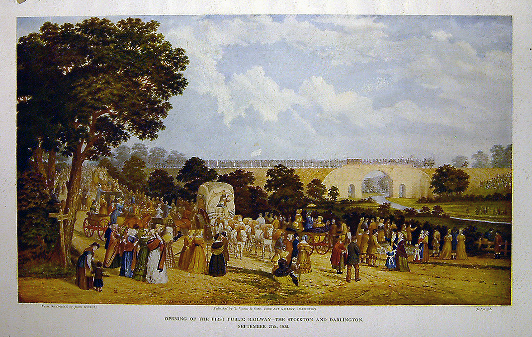 The print below, from a drawing by John Dobbin, depicts a large crowd turning out to watch the opening and shows the excitement generated by this historic event. The first train travelled eight miles from New Shildon to Darlington taking about two hours (this included three unexpected stops, two of which were due to a derailed wagon), it did however reach a speed of 15mph at one point.