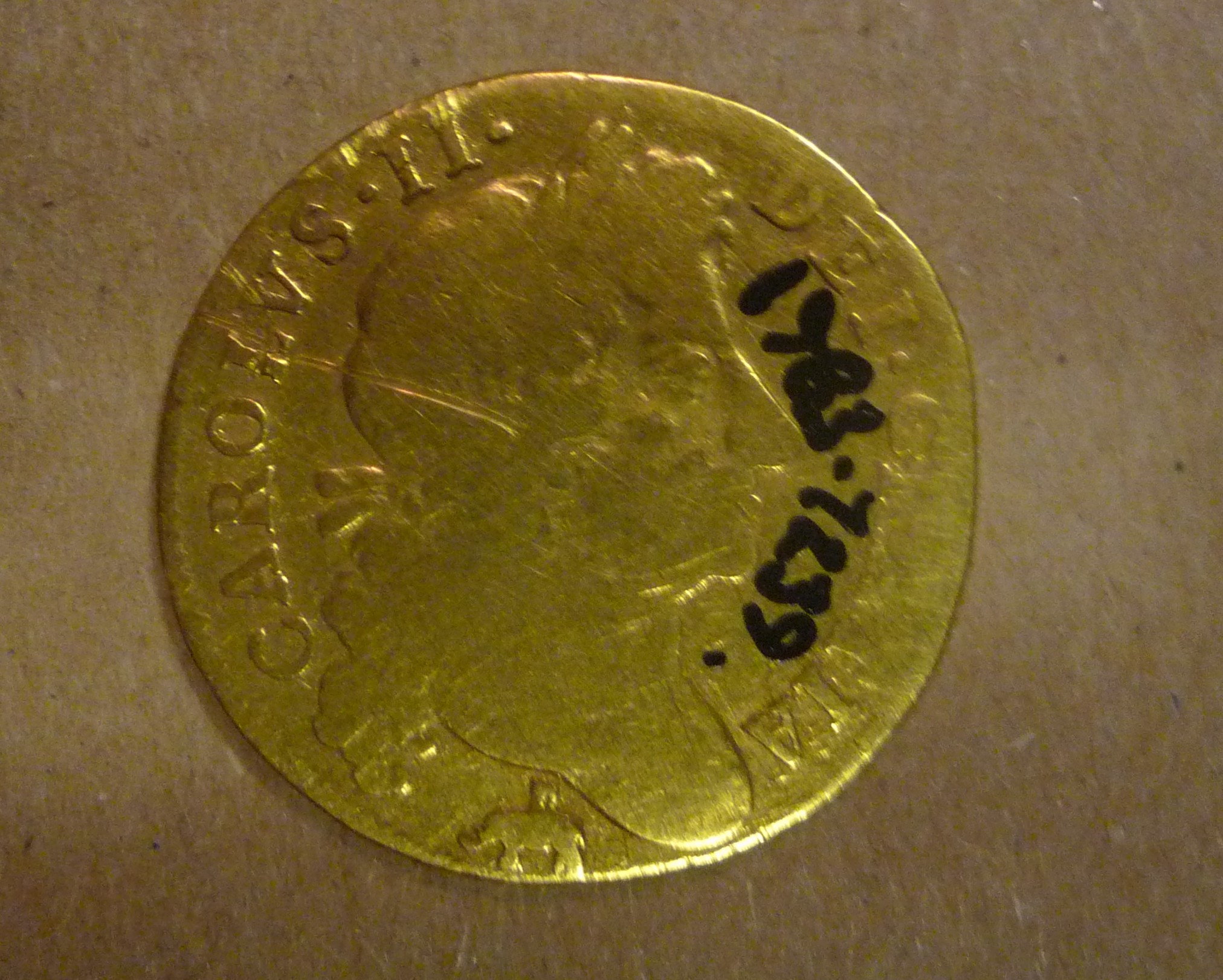 I discovered this coin quite by accident whilst looking for something completely different. It’s a gold coin dating from the reign of Charles II, and was discovered just over 200 years later, in 1881, by a navvy working on the Hull and Barnsley railway.