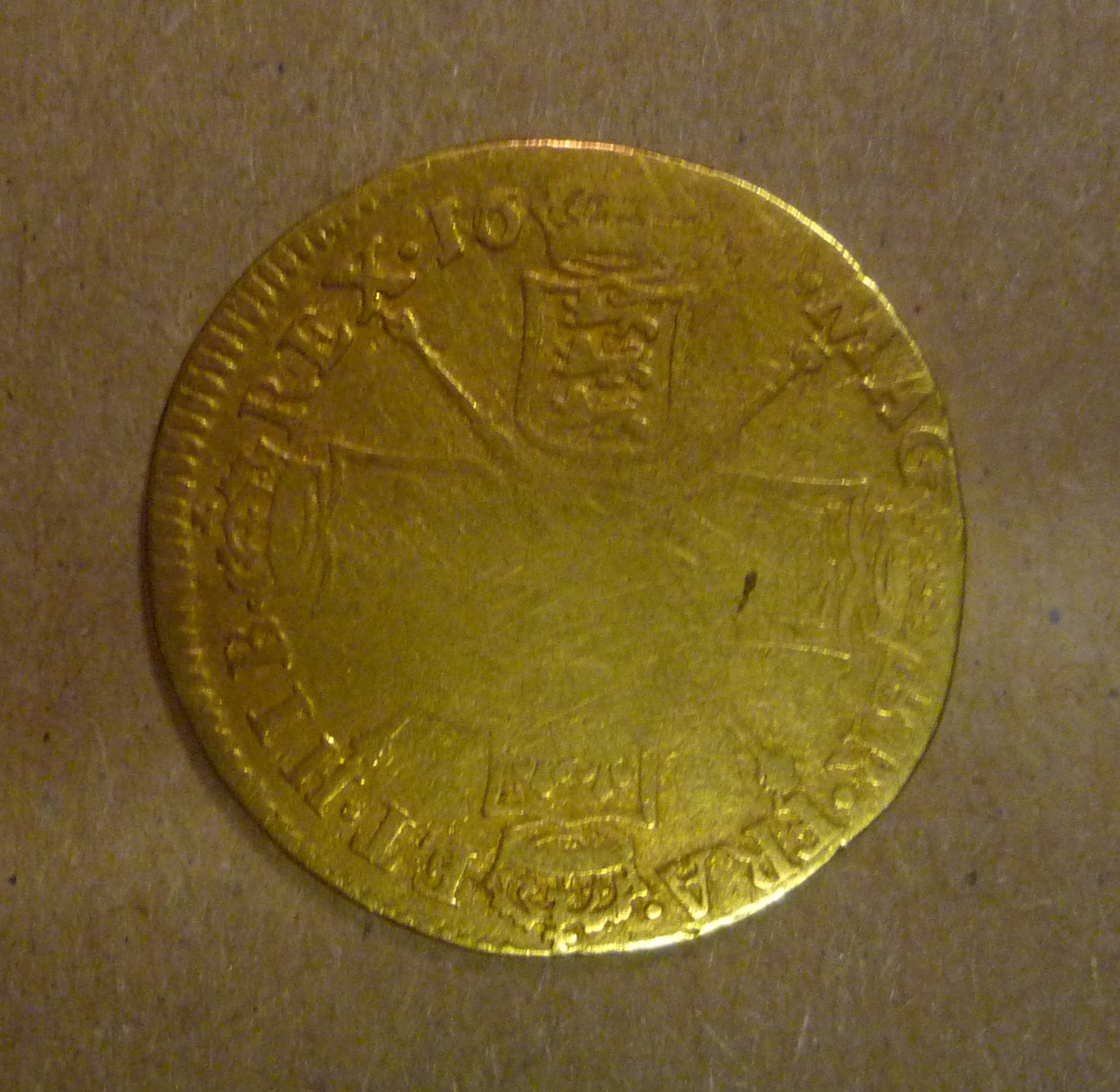 The small elephant that we can see embossed beneath Charles’ head tells us that the gold was imported from Africa by the Royal Africa Company.