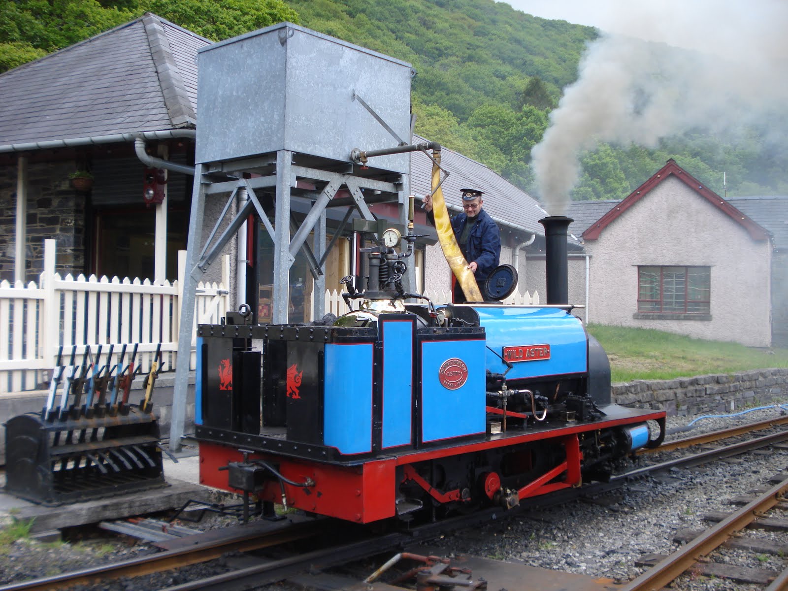 Its regular driver is Hefin Owen, son of a Dinorwic Quarry loco fitter – the railway nestles in the shadow of the quarries – and through the good offices of Julian, it was arranged for me to accompany Hefin on a 9.50am special extra departure. Hefin is here watering the loco at Gilfach Ddu station.