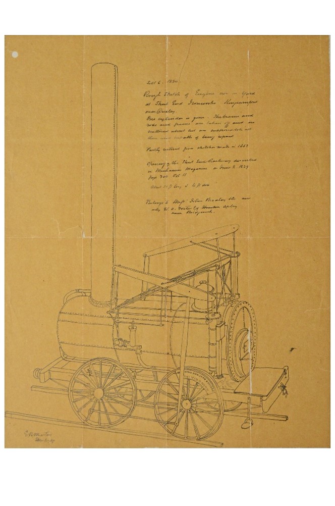 The drawing was made by and signed, “E.B. Marten” (Edward Bindon Marten, 1832-1914), in the bottom left-hand corner. The description of the locomotive, from which Edward Marten compiled his drawings, was taken from The Mechanics Magazine, published 2nd June 1829, pp300 Vol 11. The recorded date of his drawing on the trace paper is, September 6th 1880.