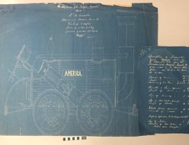 During the cataloguing review of the archive, I discovered a drawing on tracing paper of Agenoria, one of the early locomotives, currently located in the National Railway Museum’s Great Hall.