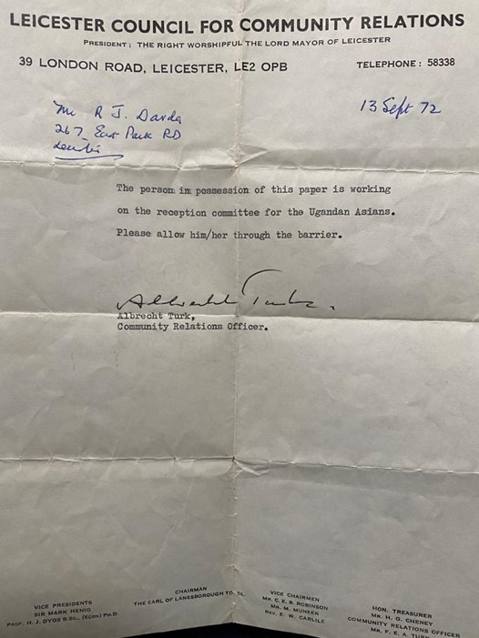 Ugandan Asians who had already migrated to Britain before Amin’s expulsion order also played an important role in the resettlement process. Rajni Davda (author and former radio presenter for Sabras Radio) along with around 20 other Ugandan Asians, volunteered to be part of the reception committee. Rajni welcomed and chauffeured people from Leicester railway station, carrying with him a letter written and signed by the Lord Mayor of Leicester to grant him access to collect them. This important work had a huge impact on safely welcoming the incoming refugees.
