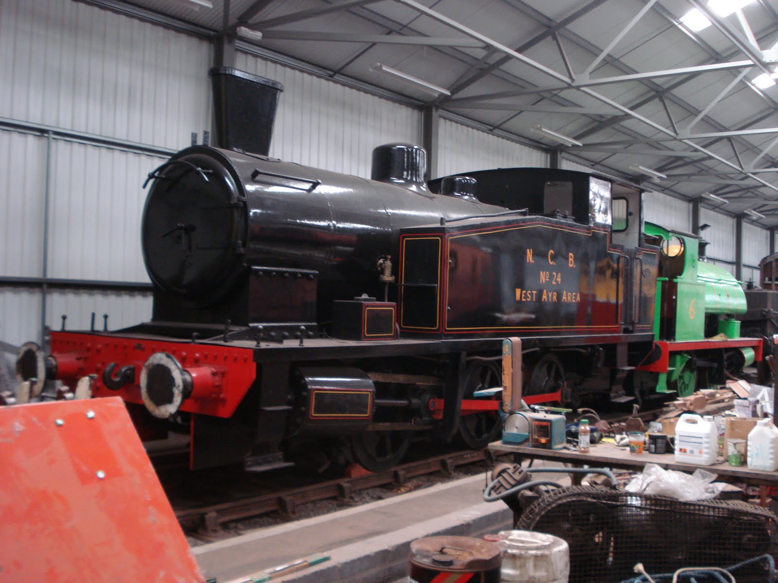 A Barclay crane tank stands in front of the famous North British 0-6-0 “Maude” with its links to World War One.