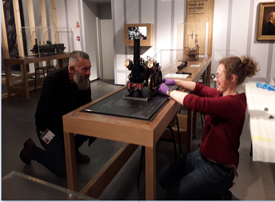 As mentioned earlier, the installation of Stephenson’s Rocket was filmed by a TV crew and Sir David Jason. They asked if Rocket could be restored to steam. This is impossible for many reasons including the fact that it no longer has a boiler. Rocket is to be preserved in its current condition as a museum object. It remains stationary so that the object does not deteriorate and wear out though use and remains as close to the same engine Stephenson built as we can preserve. The locomotive is often surface-cleaned by the in-house conservation team which also allows the object to be constantly condition-checked.