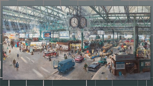 Originally, it was displayed on the promenade in the southern area of Station Hall, near to the doors which lead to the outdoor area of the museum called South Yard. The draught from the door caused a fluctuating environment in humidity and temperature which can cause a canvas to expand and contract and can affect the painting medium. It was also displayed on a timber cladding which was a distracting shade of green via wooden split battens which were then attached to the substrate.