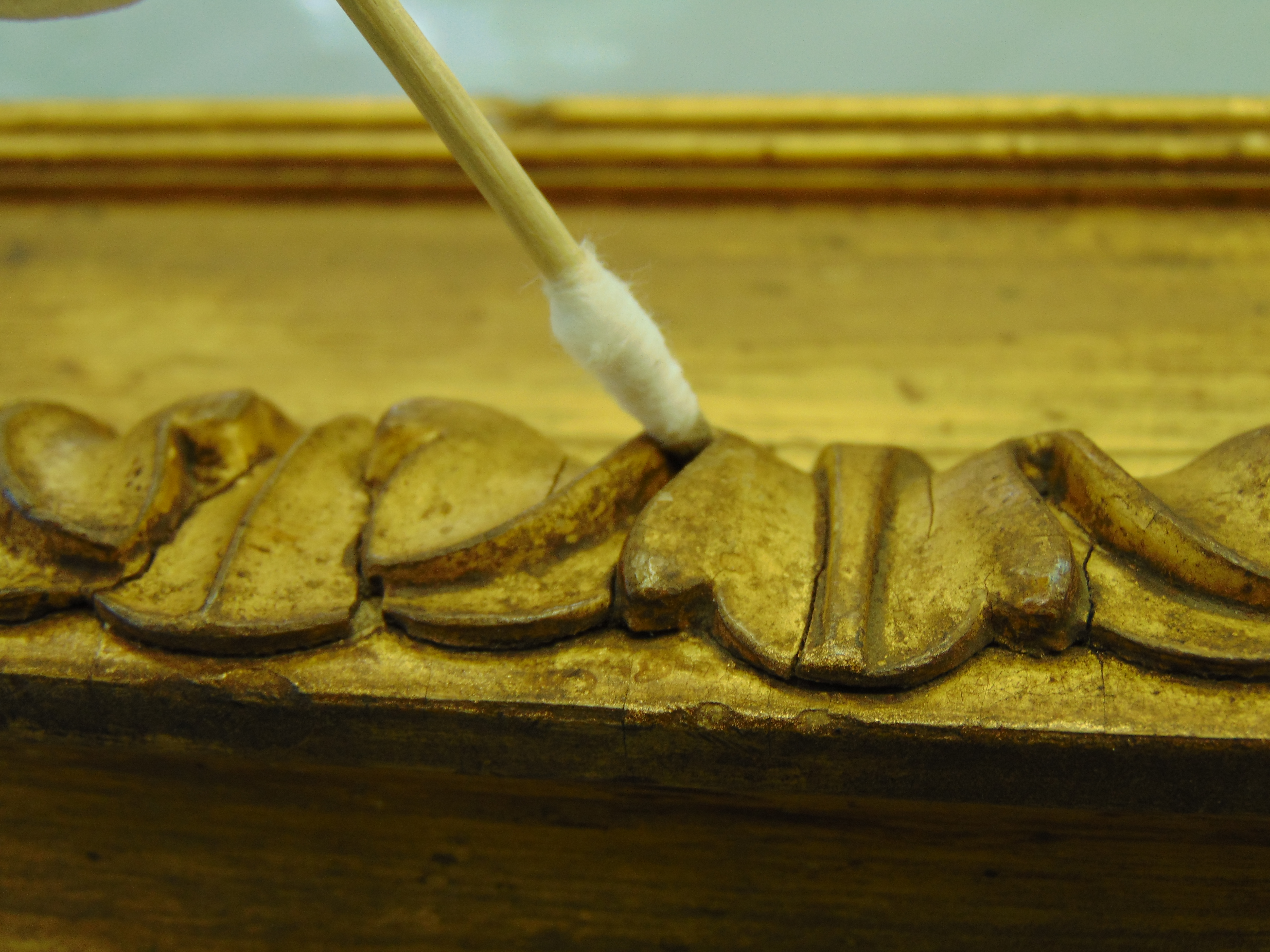 As soon as you walk into the workshop, the difference in the frame’s condition is noticeable. Over seven days (and using a veritable mountain of swabs), Izzy carefully cleaned the frame using solvents and saliva (that’s right, just plain old spit) to clean it ready for repairs and gilding.