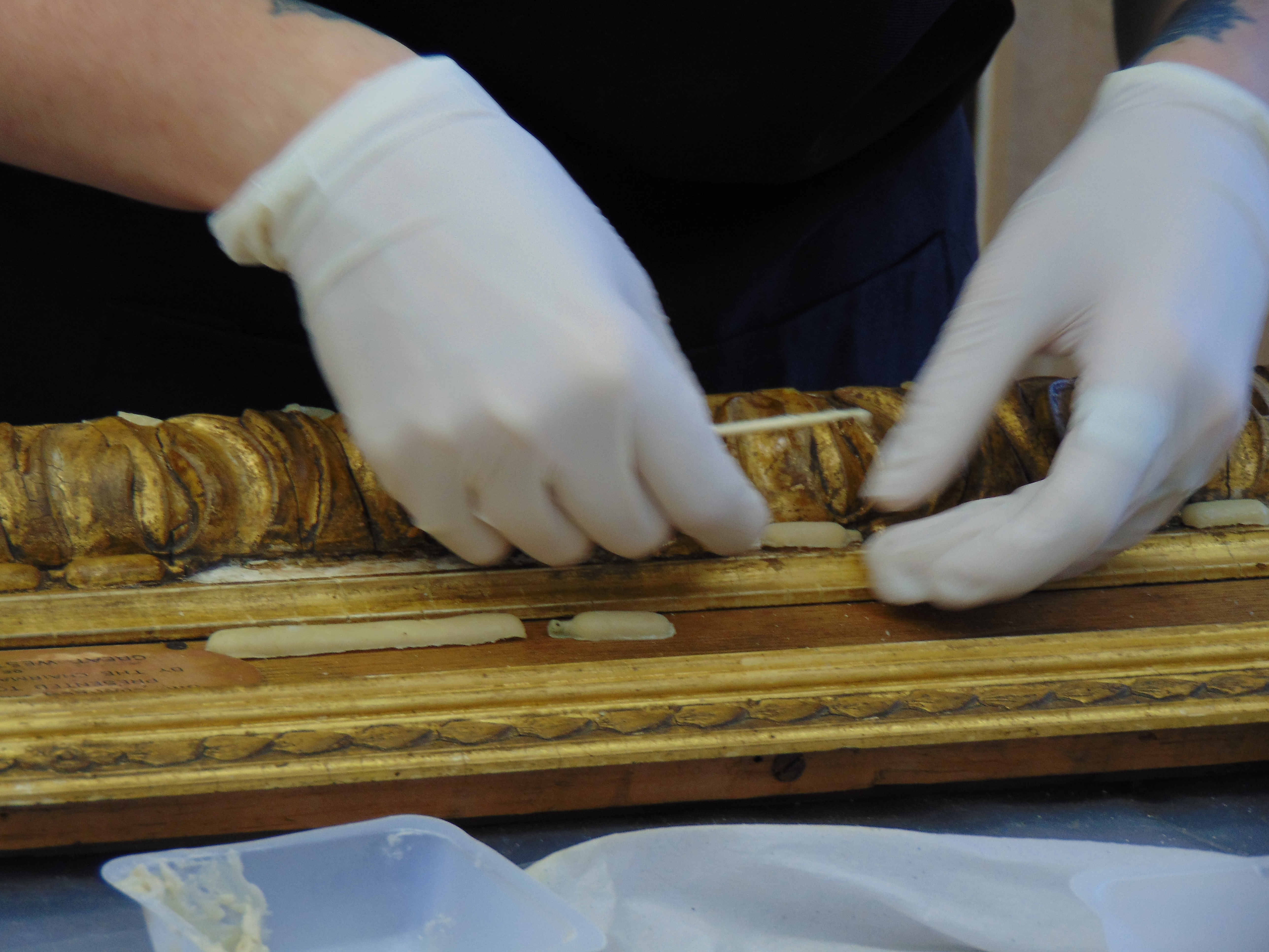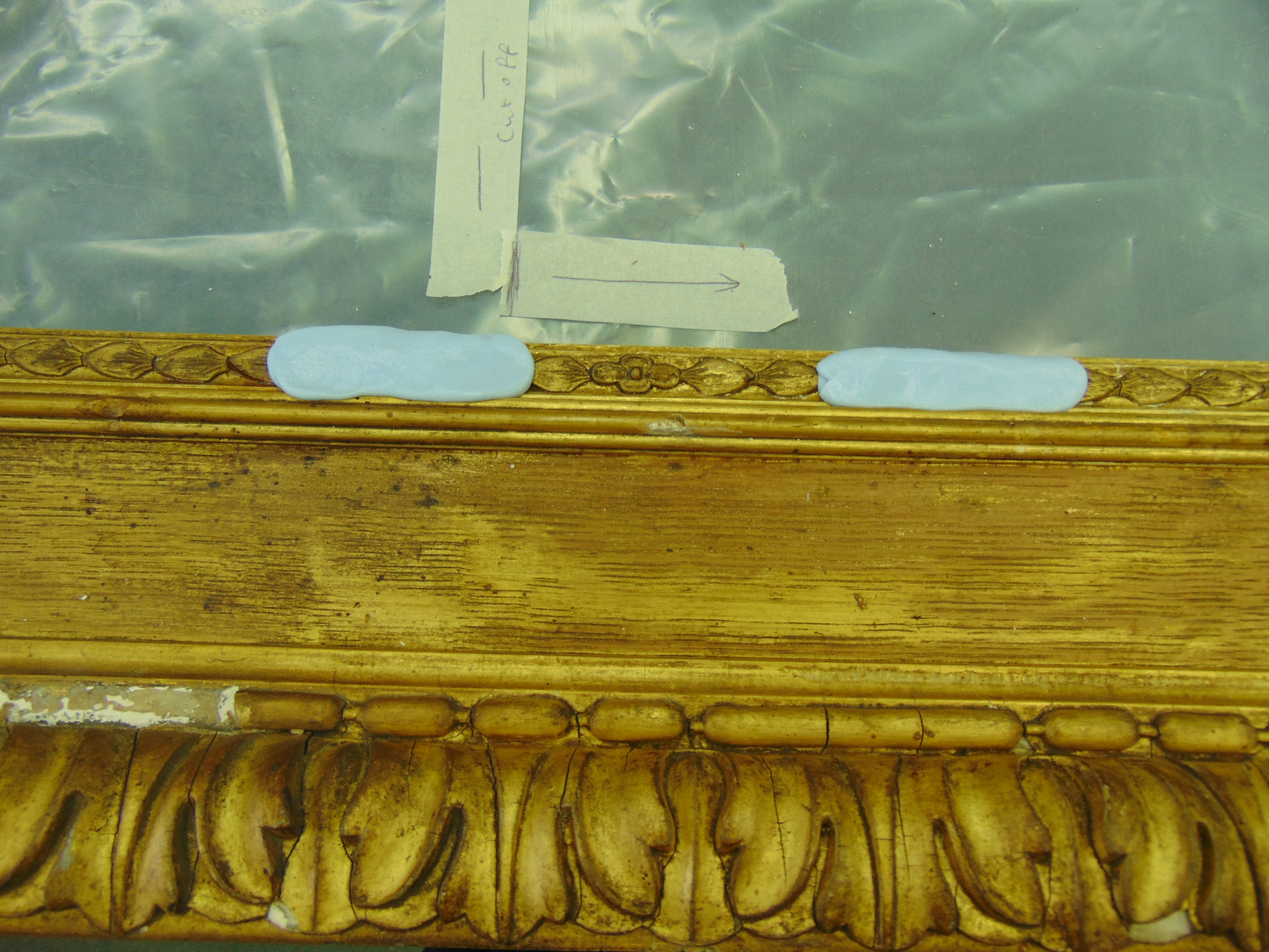 With the frame clean, the next job was to make moulds of the ornamentation, to produce replacements for various missing sections (such as the acanthus leaf design).