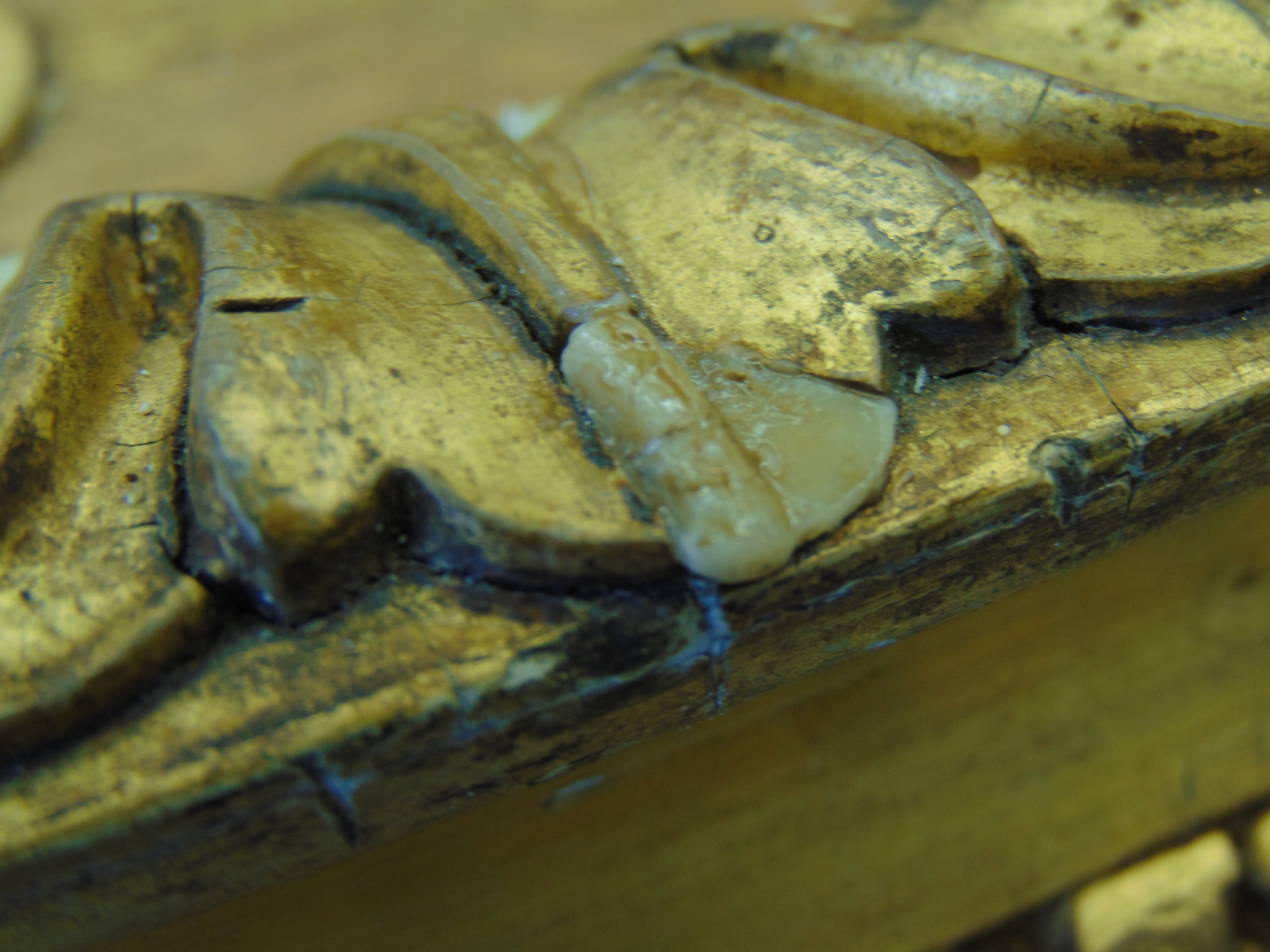 The corners of the frame presented a slightly different problem, as all four were damaged or broken off completely, leaving nothing to make a casting of. In this case, Izzy has used plasticine and dental tools to create a new corner detail which can then be cast in the same way as the leaves. This is part imagination and part detective work, using reference to other frames by the same makers to create something plausible for the frame’s period and style.