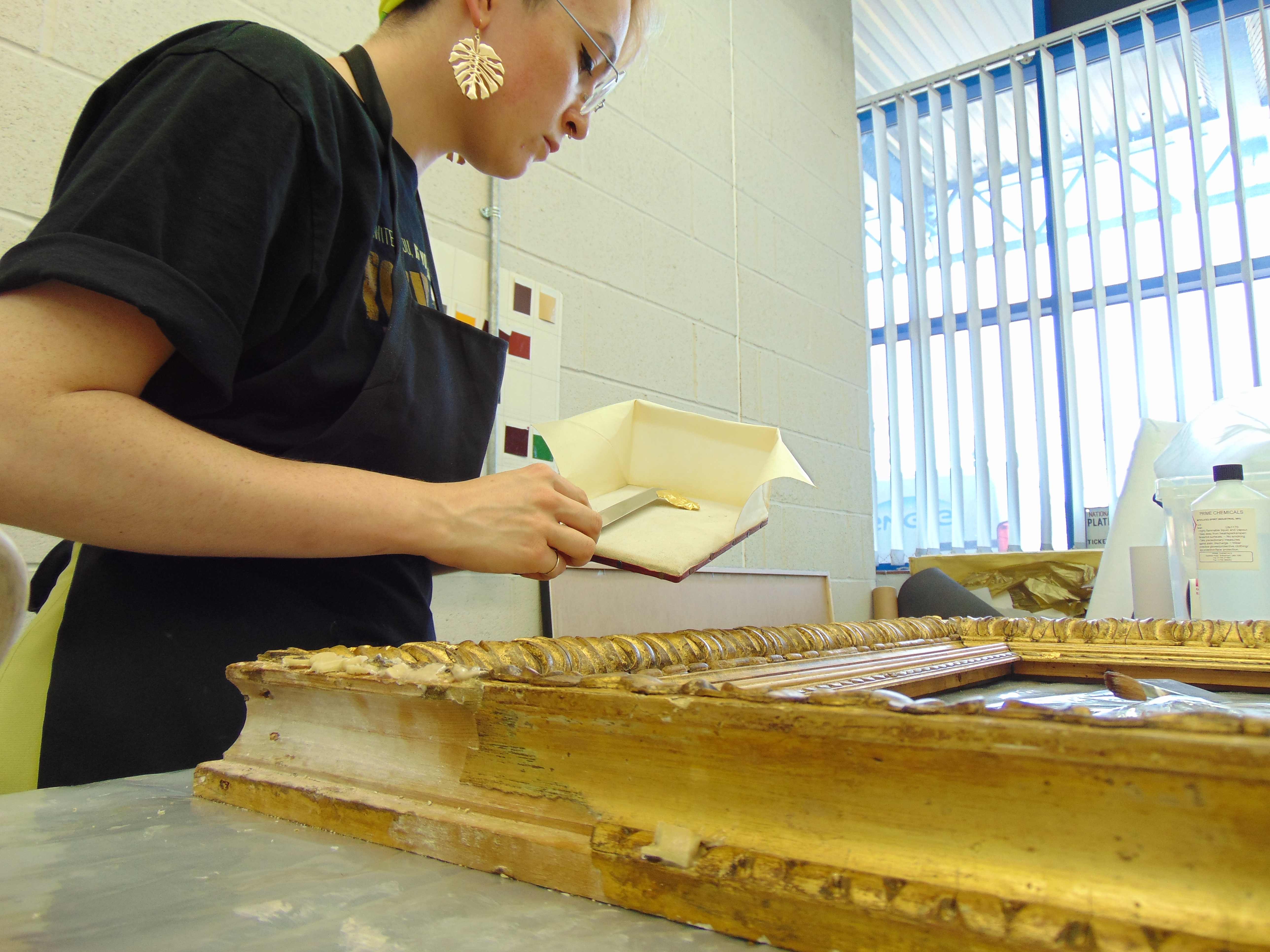 If you read the recent update from the conservation workshop, you’ll know that fine art conservation student Izzy McKie has been working hard to conserve a late-19th century gilt picture frame from the art store. Keen to see the progress, I caught up with Izzy to find out how it’s been going.