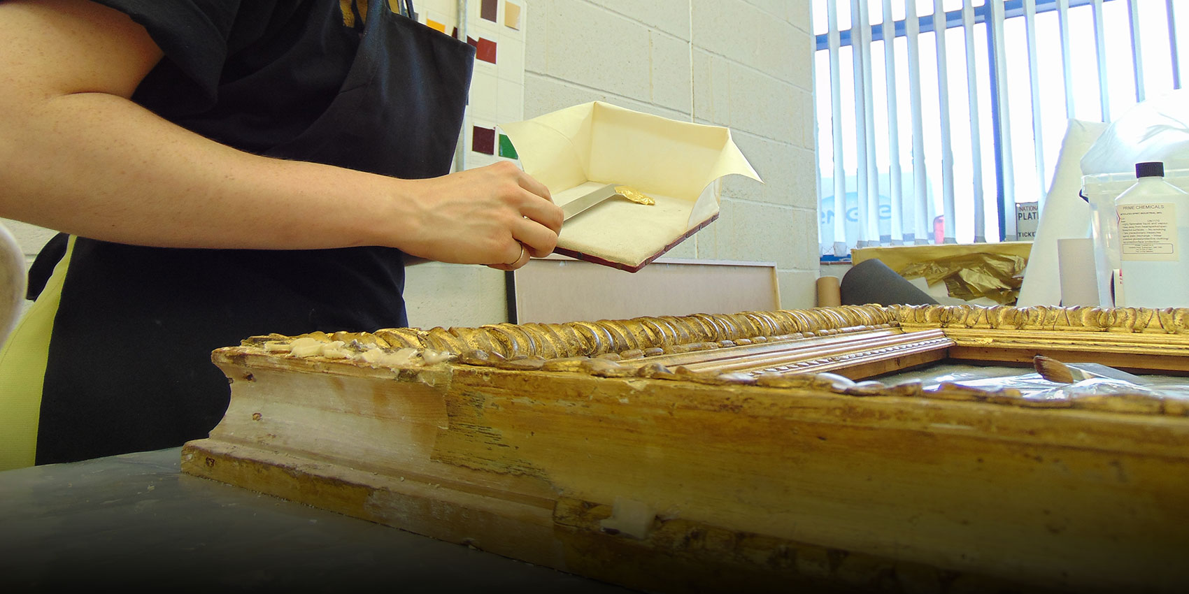 The leaf has to go on flat, making this an incredibly delicate task! Once this is all done, the gold leaf will be toned using watercolours and non-yellowing varnish. The aim isn’t to make the frame look brand spanking new, but rather to conserve it so that it survives as long as possible.