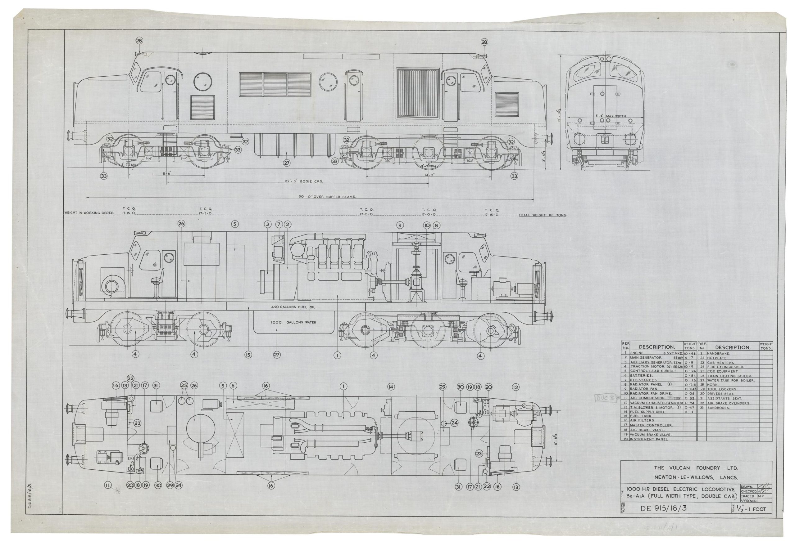 The General Electric Company (GEC) archives, which includes over a hundred thousand drawings from GEC and its predecessors like the Vulcan Foundry in Newton-le-Willows, is one of the largest collections in the Search Engine Library and Archives. Hunting through a few rolls of drawings from Vulcan Foundry on his visit, Eric was very pleased to find some of the drawings he had made decades before. One of the drawings that Eric found was this general arrangement drawing for a 1000HP diesel locomotive: