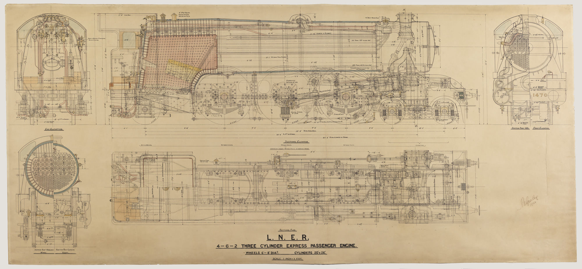 This fantastic coloured general arrangement shows Sir Nigel Gresley’s A1 class as built, just how Flying Scotsman appeared until it was rebuilt as an A3 in 1947.The drawing was signed by Sir Gresley himself in 1923 and we believe it spent much of its life hanging in the CME’s Doncaster office. It would have taken many hours of careful work to painstakingly hand draw and colour this drawing – all the more daunting for the draughtsman given where it was to spend its life.