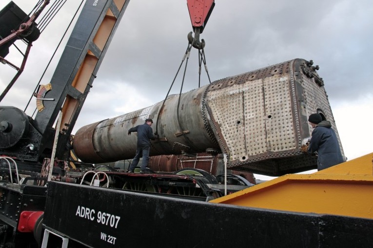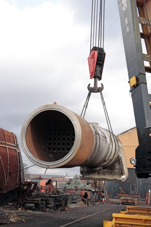 A quick Flying Scotsman update: the boiler has been lowered onto the rolling chassis at Ian Riley’s yard in Bury. After a few minor adjustments, the boiler fitted well. The next stages of work will include the completion and installation of the superheater system and the fabrication of boiler cladding.