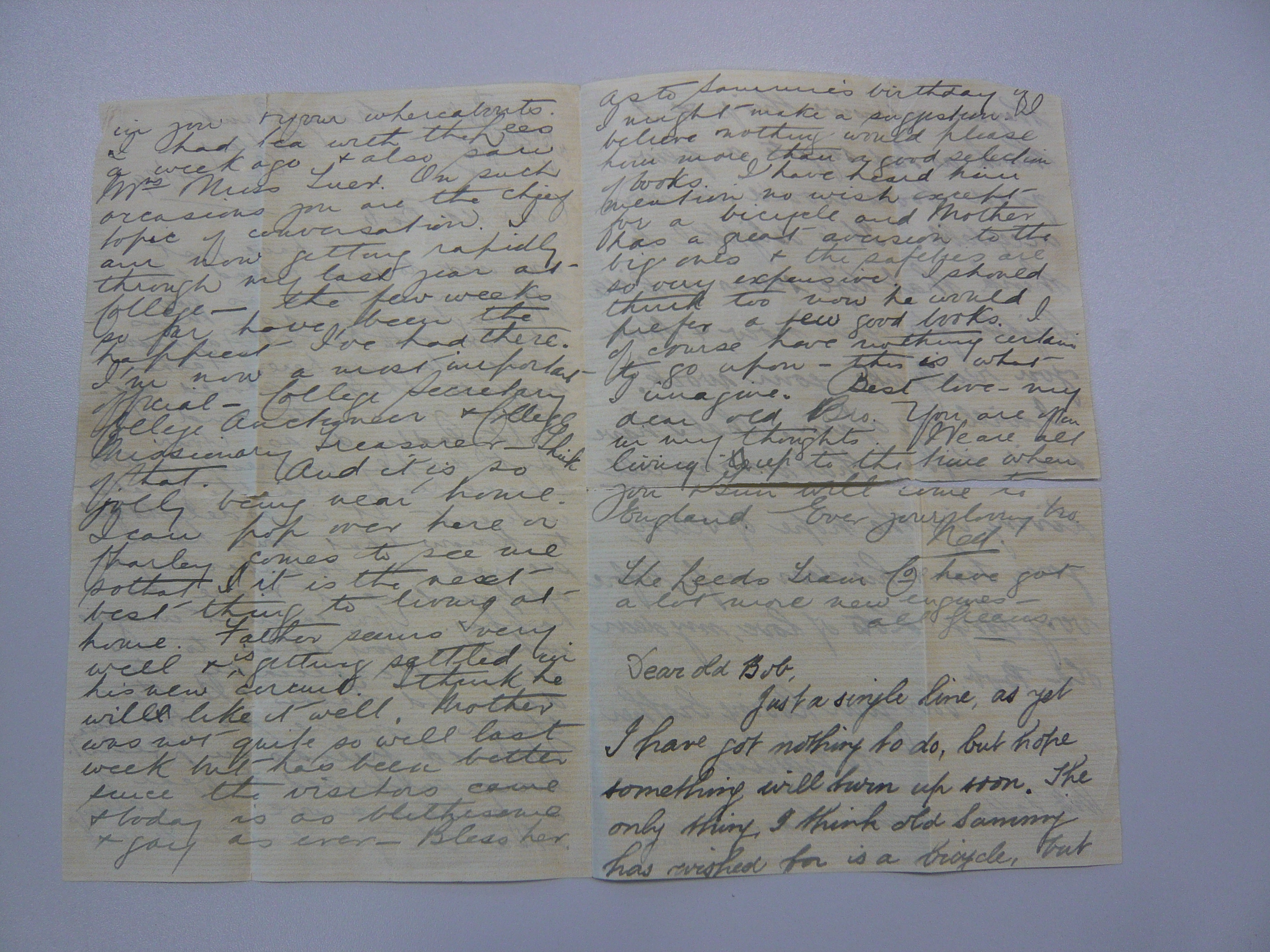 … as to Sammie’s birthday if I might make a suggestion. I believe nothing would please him more than a good selection of books. I have heard him mention no wish except for a bicycle and Mother has great aversion to the big ones & the safeties are so very expensive. I should think so now he would prefer a few good books.