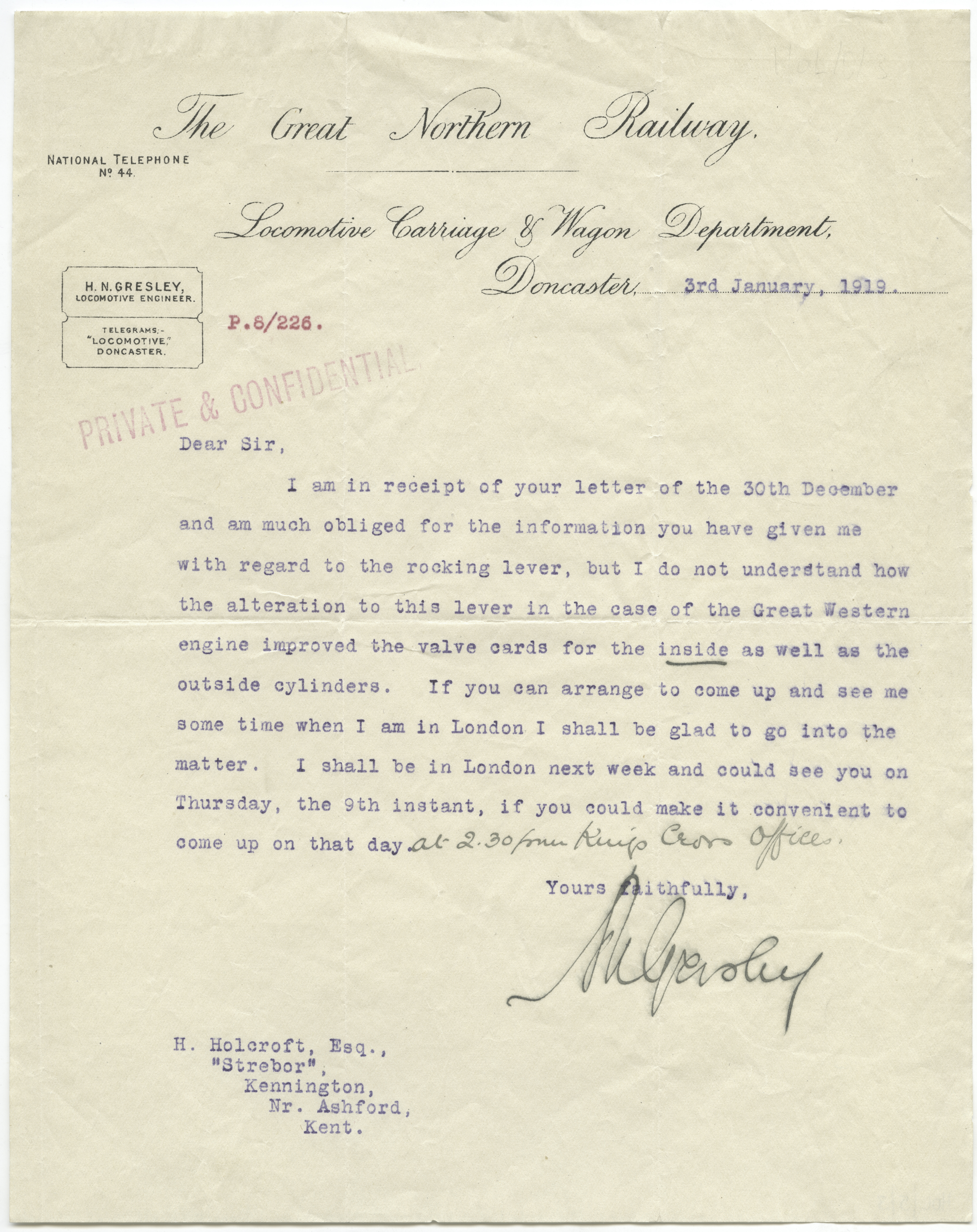 Holcroft moved to the South Eastern and Chatham Railway (SECR) in 1914 and immediately set to work influencing Richard Maunsell’s designs – assisting in the design of the N-Class, which once again used Holcroft’s favoured “Mogul” arrangement. In 1919, Nigel Gresley requested a meeting to discuss their ideas regarding three-cylinder locomotives. Following their collaboration, Gresley incorporated some of Holcroft’s ideas into his three-cylinder designs. Gresley inquired as to the possibility of hiring Holcroft, but Maunsell refused to allow it.