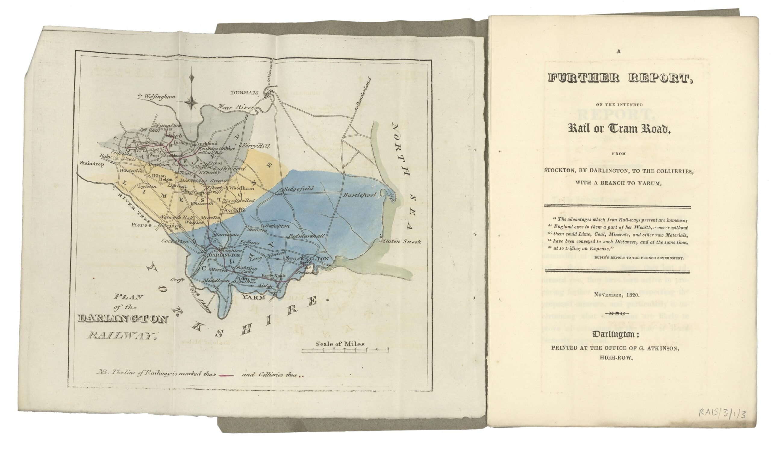 It was not inevitable that a railway would be built to link Stockton with the coalfields, and the Raisbeck archive gives insight into this. Earlier schemes to connect the inland collieries of south-west Durham with the River Tees centred upon the construction of a canal. However, on 18 September 1810, Leonard Raisbeck, solicitor for the Tees Navigation Company and Recorder of Stockton, opened the door to a possible rail connection at a dinner celebrating the opening of a new cut to shorten river navigation on the Tees. The archive shows that two principal resolutions emerged that day: