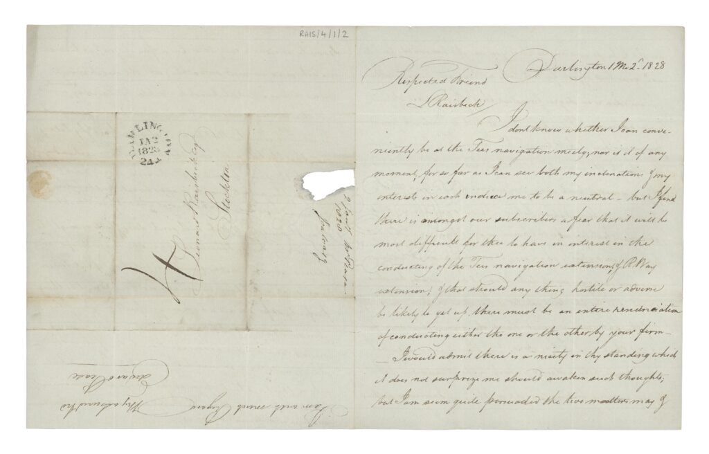 Writing on 2 January 1828 in advance of an S&DR board meeting, Pease reminded Raisbeck of his conflict of interest, that ‘there is amongst our subscribers a fear that it will be most difficult for thee to have in interest in the conducting of the Tees navigation extension; & RWay extension’.