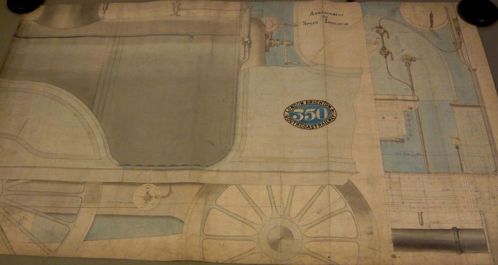 Our attention soon turned to the London, Brighton and South Coast Railway Class G – designed by William Stroudley. The first of Stroudley’s speed indicators was fitted to locomotive Grosvenor, built in 1874. 13 more locomotives were ordered with some modifications, the last being delivered in 1881. Of course the fitting of the speed indicator to the prototype could have been a one-off. so the clincher came in the form of two images we found. The first was a photograph of No.336 Edinburgh, clearly showing the speed indicator fitted to the frames behind the single driving wheel. The second was a set of drawings in our archive showing Stroudley’s patented speed indicator. One drawing shows the speed indicator as fitted to No.350 Southbourne (below).