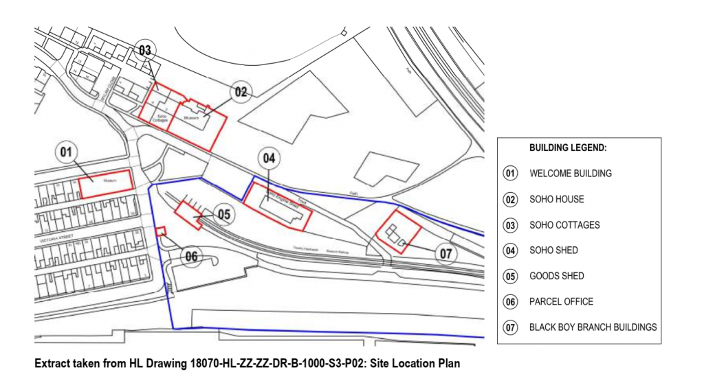 The Locomotion museum is split into two distinct areas, the oldest and historic part containing Soho House (Circa 1830), the Soho Cottages (Circa 1830), the Soho Shed (1826) and the Black Boy Branch Buildings (Circa 1830/1858 are all Grade II listed buildings, Goods Shed (Circa 1857/1896), Welcome Building (1888) and Parcel Office (1900) are the 7 buildings being worked upon and are sited within the Shildon Conservation Area and are considered nationally important.
