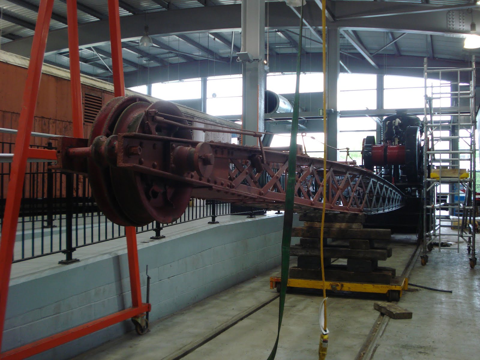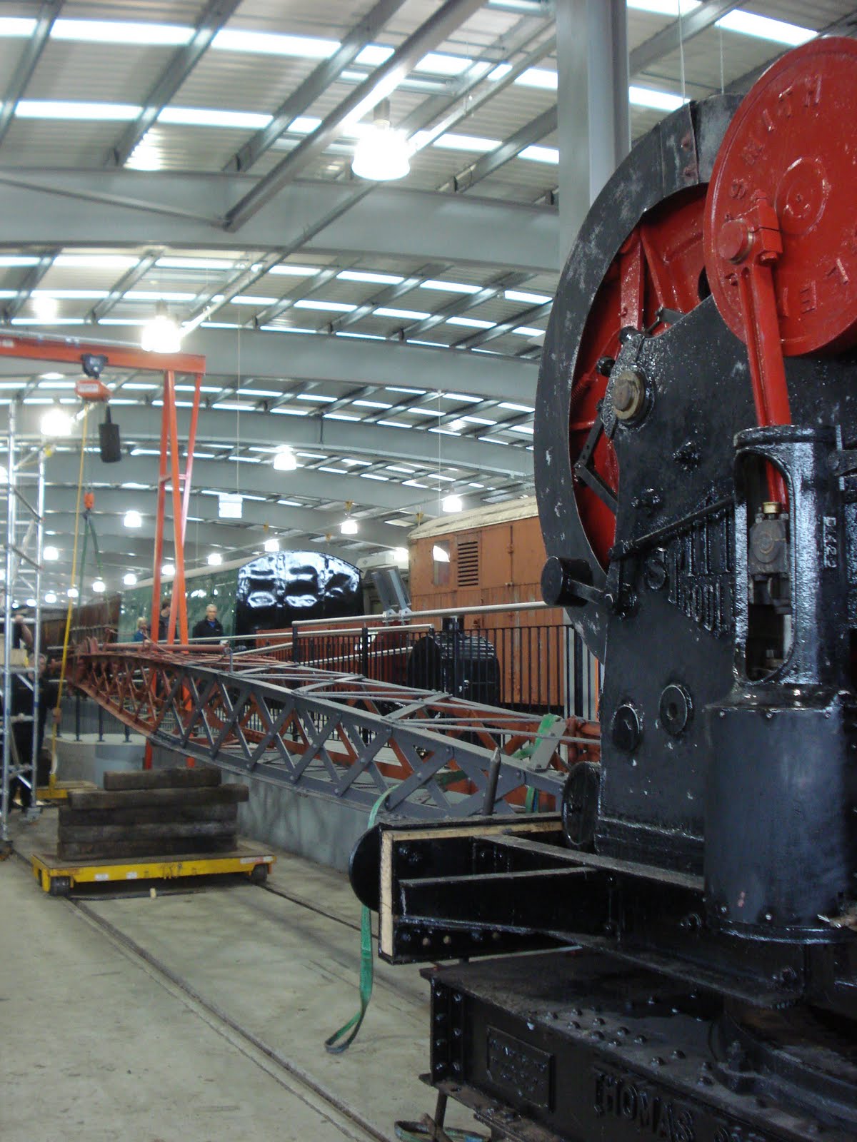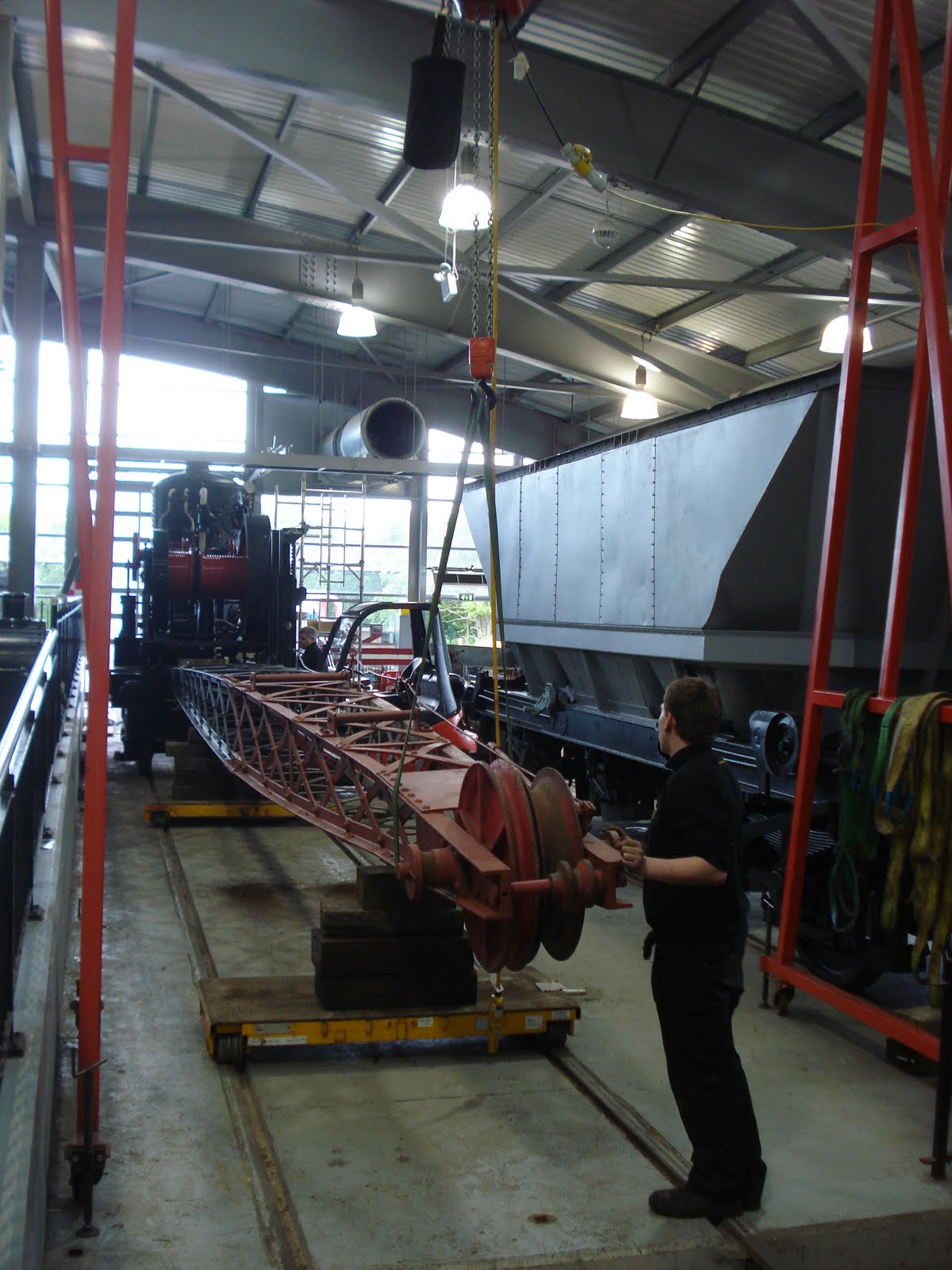 This afternoon, the restoration of the five-ton-capacity Smith Rodley steam crane in the Shildon workshops took a big step forward when Richard and Johnny fitted the jib for the first time. It’s only on for a trial basis, whilst we measure up for new ropes, check alignment etc, but it does look good – as well as giving us an idea of the size of the completed item. Here, with the jib suspended from the gantry crane and the other end on the fork lift truck, Johnny helps to align the jib whilst Richard tweaks the other end.