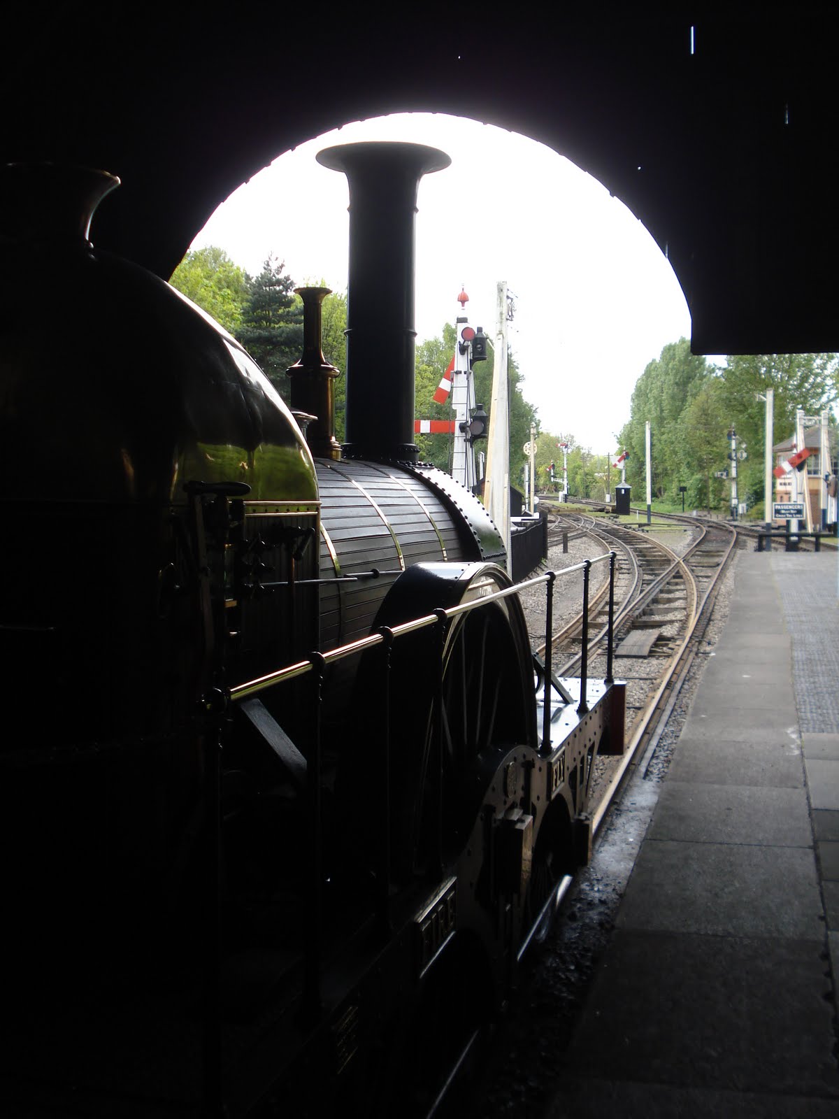 After an overnight stay in the town and an evening walk around the railway village, we headed back north today via Didcot Railway Centre, 14 minutes by train from Swindon and another loan partner for us. This year is the 175th anniversary of the Great Western Railway, and Didcot, based in the former GWR loco depot, has just completed a mammoth 9 day festival celebrating the fact. Here, one of the visitors, 7827 “Lydham Manor” from the Dartmouth Steam Railway, is seen at the entracne to the shed, with other rolling stock to the right.