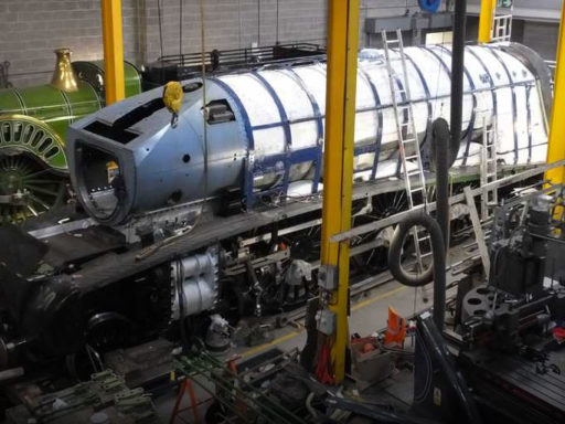 Work continues on locomotive Sir Nigel Gresley in the National Railway Museum workshop.