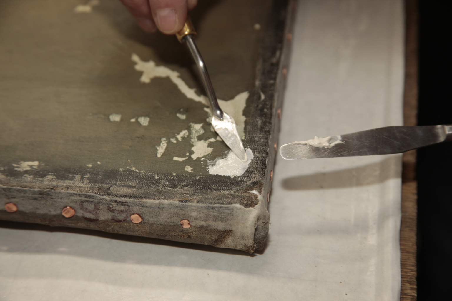 Once all of the structural work is complete, the paint losses, which are numerous in this painting, are infilled using a chalk based filler and a pallet knife. The fillings will later be retouched with powder pigments ground in a synthetic resin. The painting will be sprayed with a varnish of synthetic resin to protect the paint layer and enhance the colours.