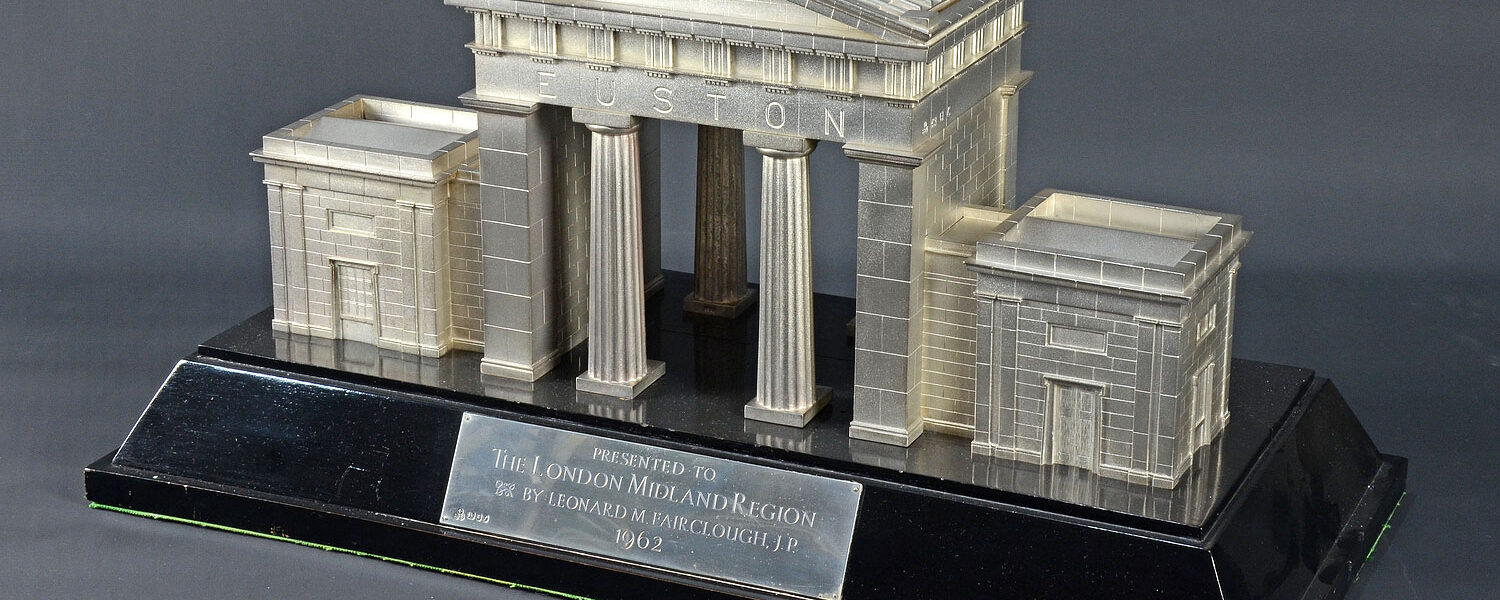This model of the Euston Arch was commissioned for Phillips of New Bond Street by the demolition contractor. The plaque states ‘Presented to The London Midland Region by Leonard Fairclough JP 1962’.