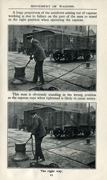 A huge variety of grades of railway employee are found in the accident cases. They are clustered around staff doing goods work or at work on and around the lines, as this is where most danger was focused. They also show some of the breadth of railway operations—including at ports. On 20 June 1924, Great Western Railway coal tipper Alfred Cooke, 25, was at work at Barry Docks, Glamorganshire, Wales. He was towing a wagon using a capstan when the rope became detached and struck him on the legs. Fortunately it only bruised him, but it could have been a lot worse. Capstan working was a frequent source of casualty on the railway. In this case the accident investigation noted that capstan hooks should be made more uniform in shape.