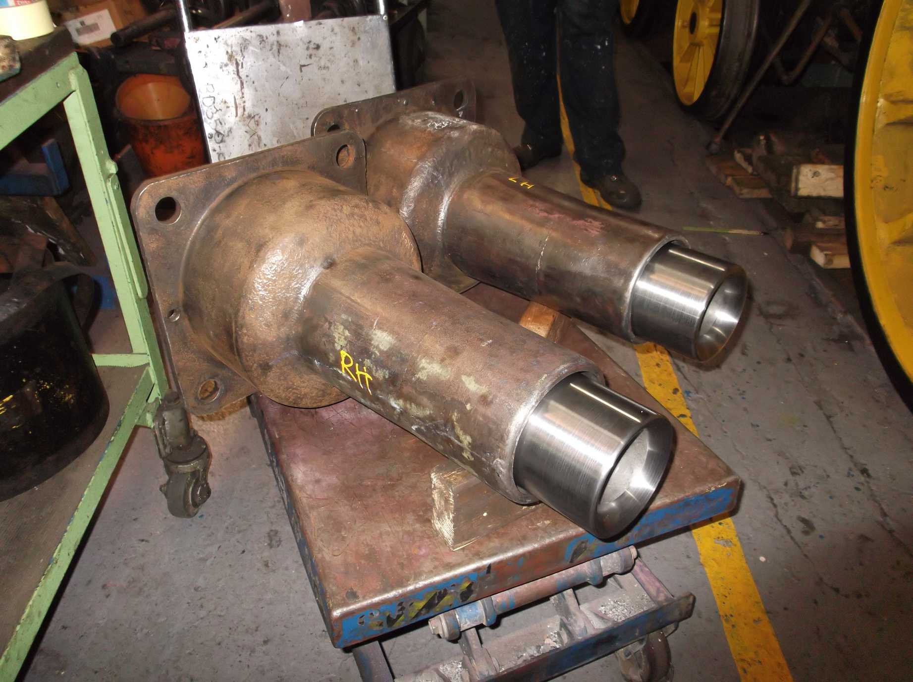 The refitting of the steam sands filler pipes was completed this week. Like many parts around the engine, they have been examined and repainted off the loco. Particular care was taken to ensure that water can’t get into the sandboxes, so new seals and packings have been fitted. Fitting also ensured that there is clearance around the pipes where they go through the frames to ensure no chafing in traffic. Very elegant they look, too; much better than on another Gresley Pacific we have recently shared workshop space with, which has angular looking fabricated pipes.