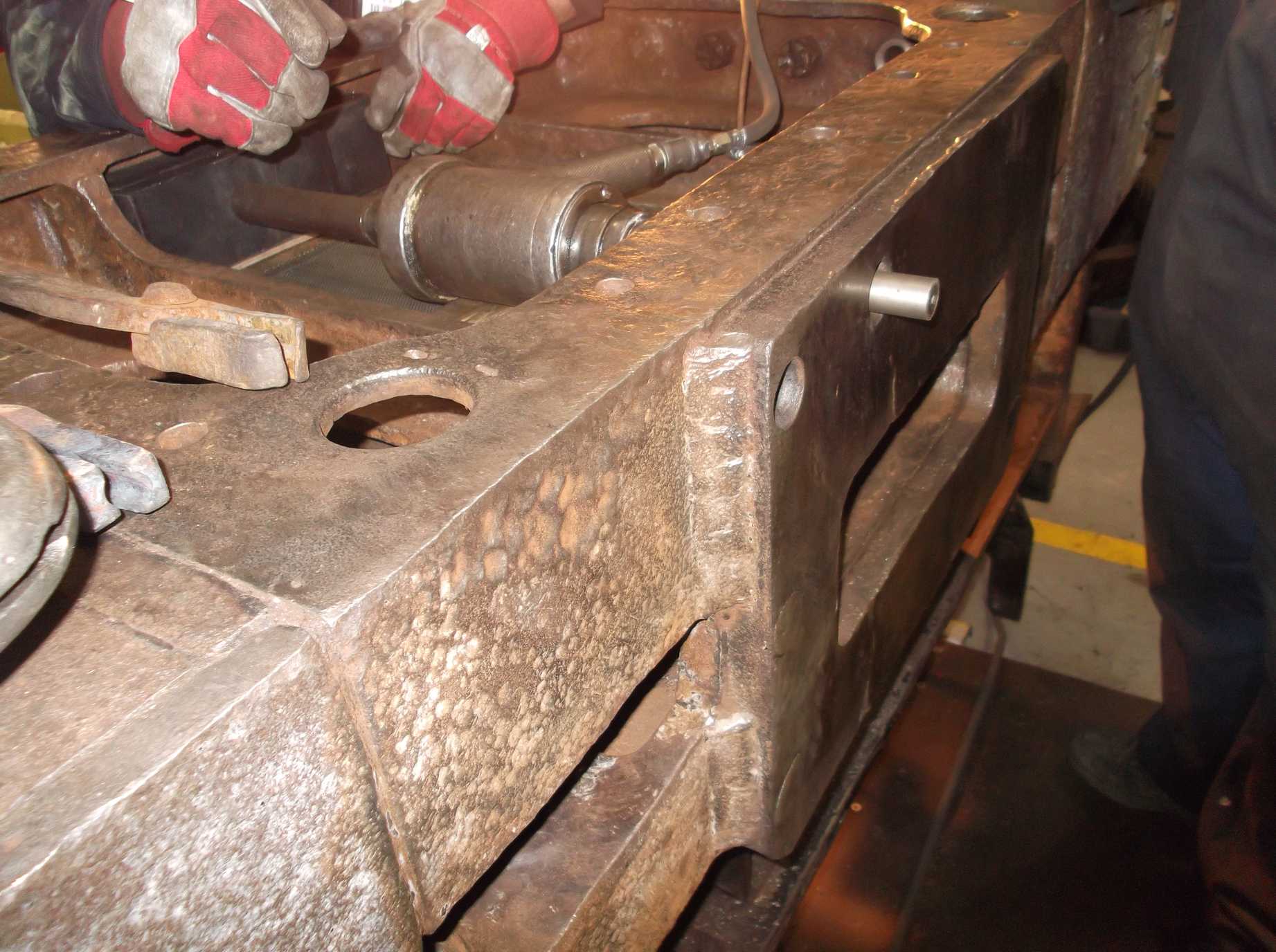 As the bolts are long and the jacks have short strokes it takes a long time to set up, jack the bolt and then insert more packing and start to jack the bolt again. A middle slidebar stretcher fitted bolt identified as requiring replacement during the frame survey was removed for replacement this week and reaming of the hole began.