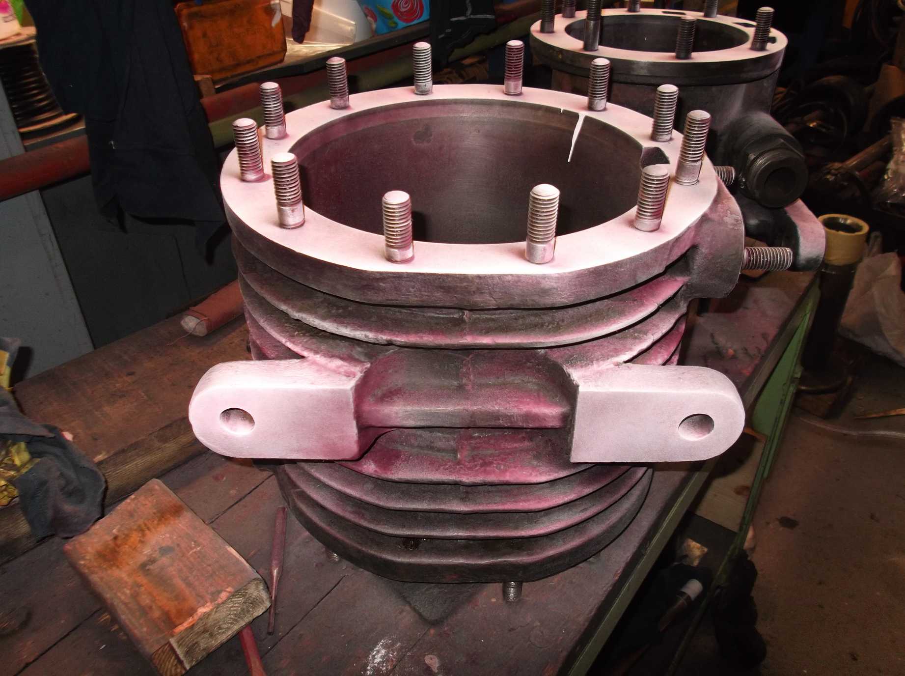 The saddle casting was signed off last week by our Chief Mechanical Engineer (CME), subject to some minor repair work. This allowed the painting team to work on it. After a brief visit by the needle gun a coat of high-temperature silver was applied. The rear flange of the saddle has been left unpainted as there are numerous holes from fastening down the smokebox, not all used, so they will be welded up and re-drilled after the refitting of the boiler.