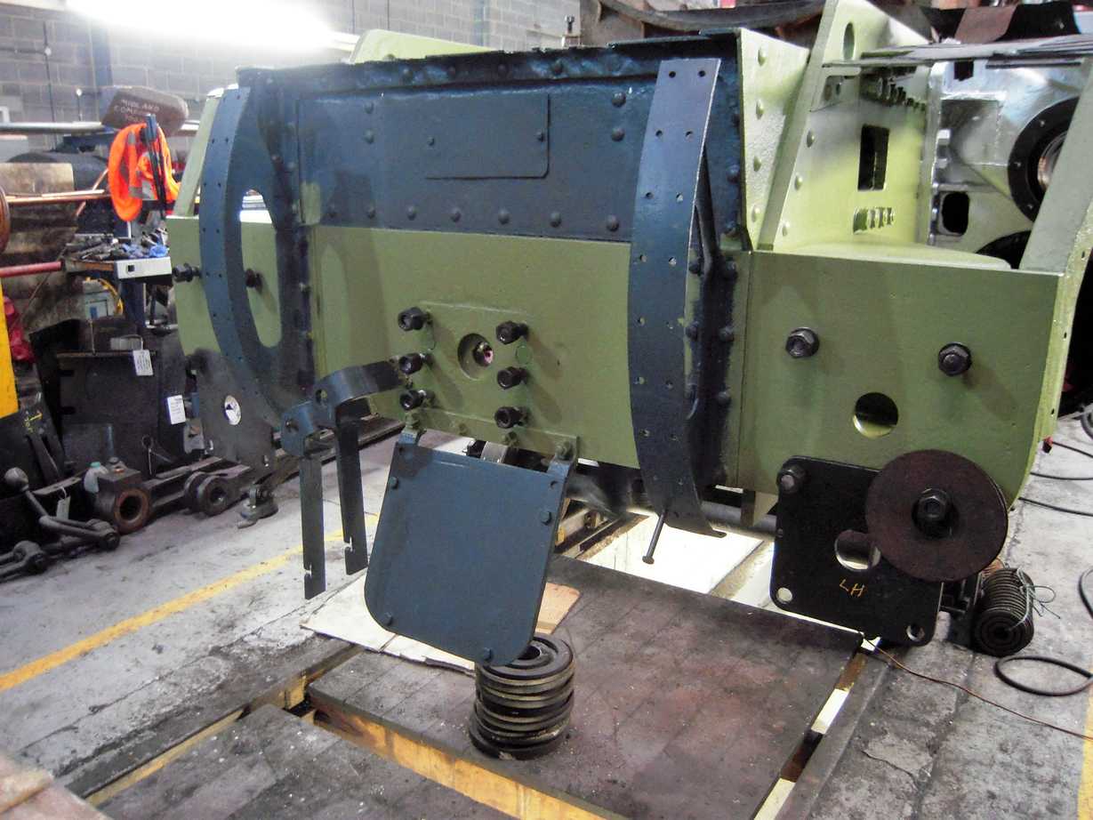 The horn castings have now all been examined and di-pen tested with the last one completed on Tuesday. The painting team were straight on to the castings and they have now all been primed. Painting continued between the frames this week. On Saturday the repaired leading right hornstay returned to York and was refitted by our junior volunteers, the ‘007 Gang’, under the guidance of our CME. With this refitted, the leading left was then removed for repair.