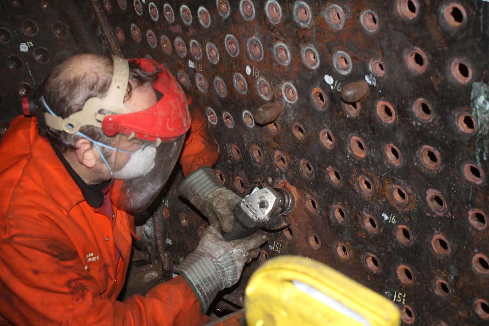 While riveting the splasher brackets on Wednesday we also replaced 2 rivets in the dragbox. One was 3/4″ and one 7/8″, which closed up very easily, a relief after the time it takes for setting up. We must thank the riveter for allowing us to use his riveting equipment and also for his foresight in saving it from the scrap man once the shipyards on Teesside ended riveting.