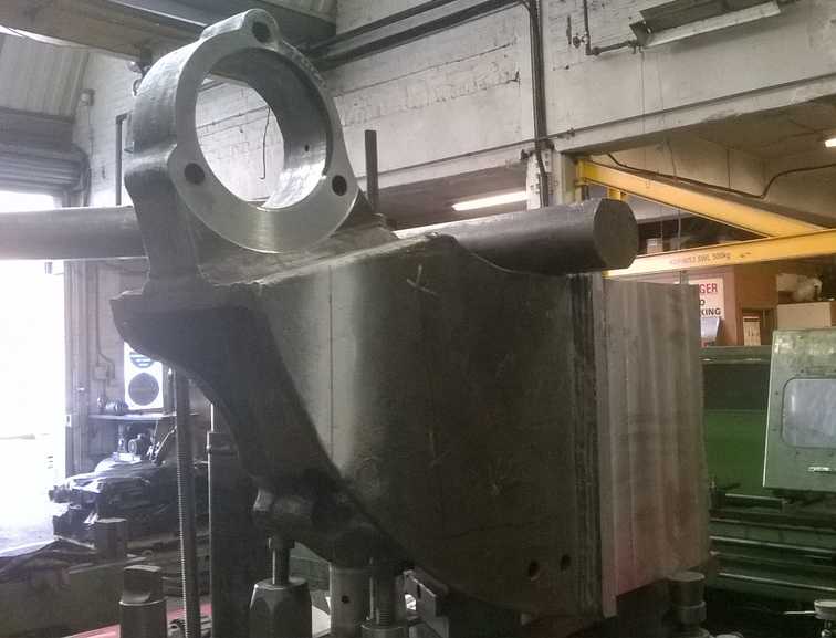 The combined brake and spring bracket is doing very well at the works of K D Flavell. It has now been removed from the borer and will be put on a milling machine to do the final skimming of the bracket edges. The boss that holds the brakeshaft bearing is now true to the bracket section and the bracket is truly flat and square. The recess in the lower side of the bracket which accepts the Spenser spring box is yet to be rebuilt with weld and machined, however we were very fortunate that due to the careful machining of the boss section that this can now be retained without building up or replacement. During inspection at Flavell’s a number of cracks were found in the bracket and these have now been repaired. When the bracket is completed it will again be fully examined for defects before refitting to the loco.