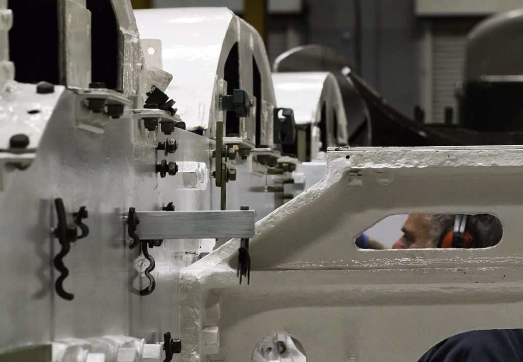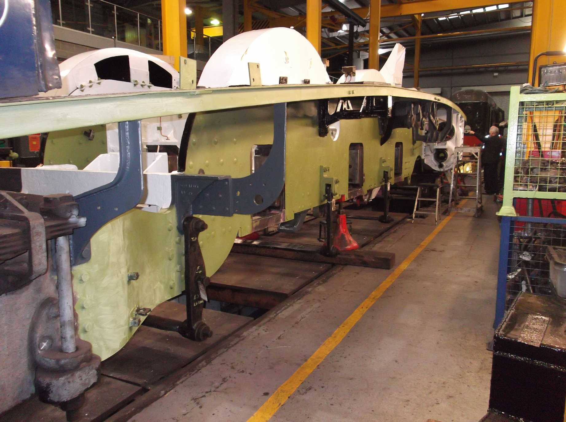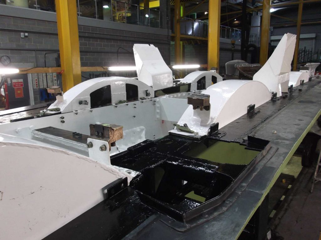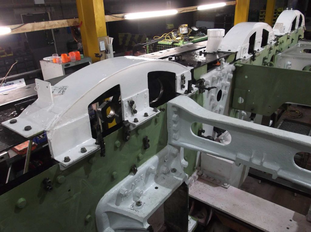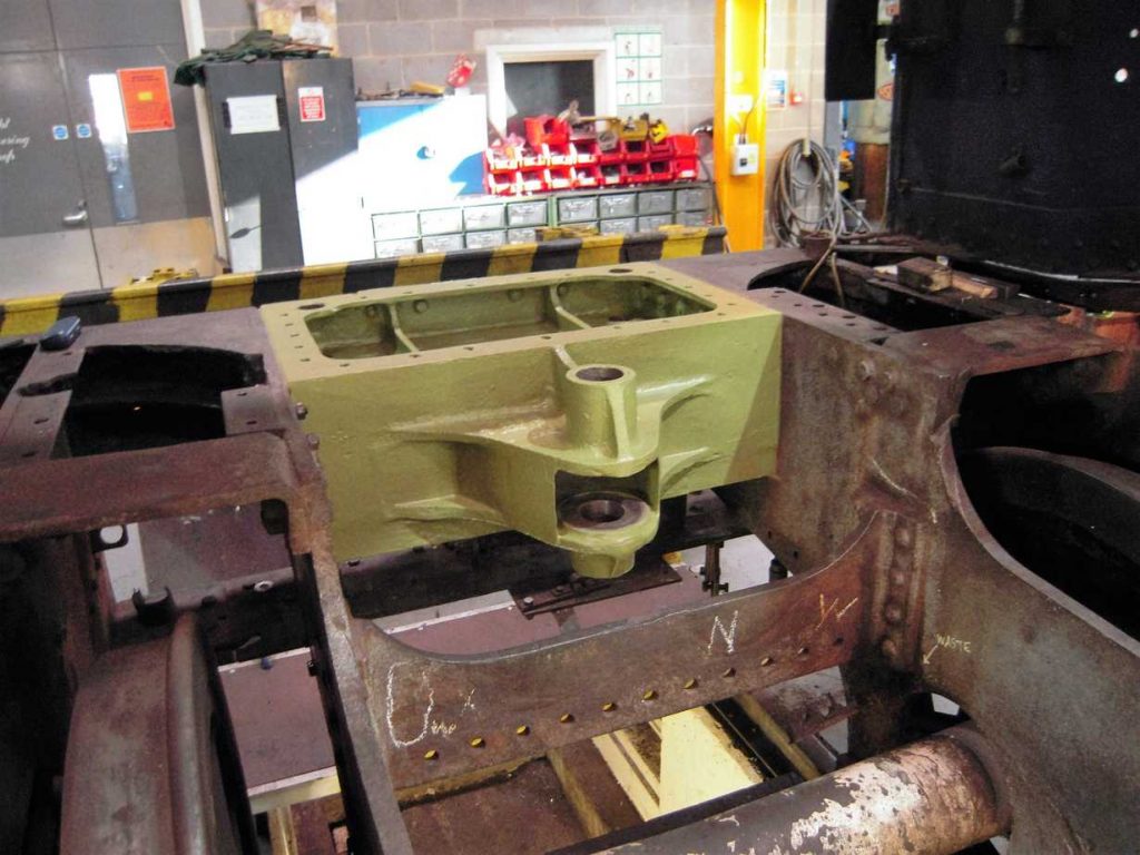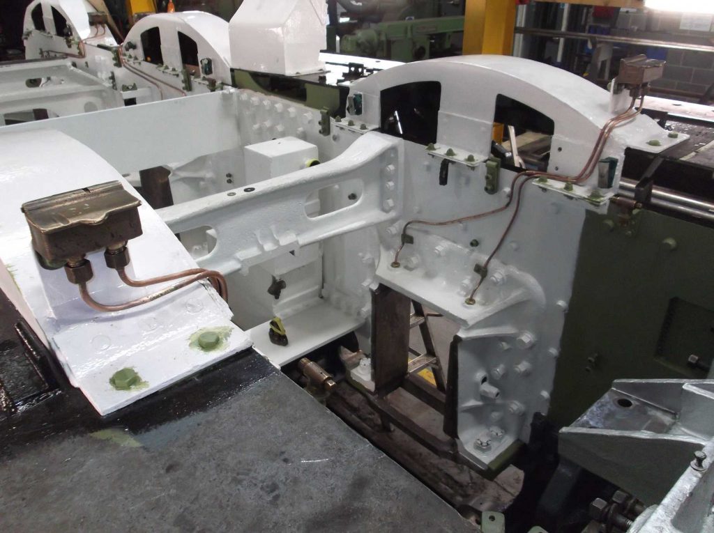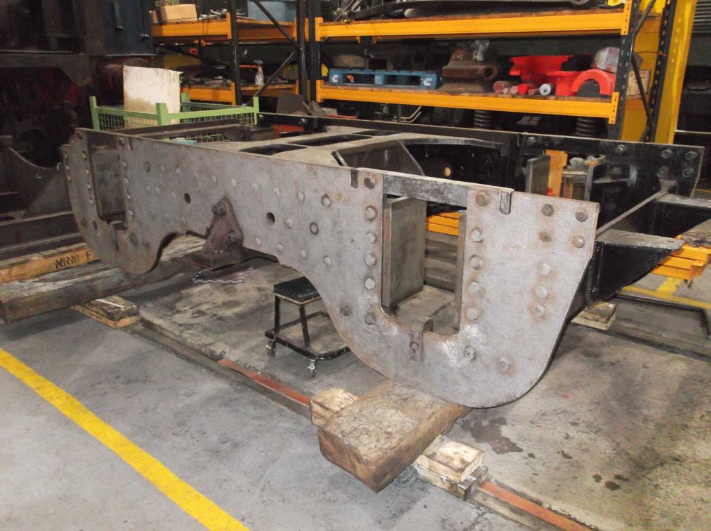 The bogie has been out of the news recently so it’s time for an update. The bogie axlebox inspection has now been completed and we await the report from our Chief Mechanical Engineer. He has now moved on to examine the bogie horns. The bogie frames have been needle-gunned and the outside of the frames are down to bare metal. There is still work to be done on the inside of the frames before they can be fully examined.