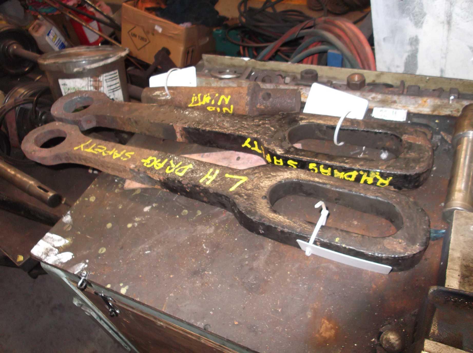 The coupled wheel springs were given a clean off this week and the spring buckle pins and retaining boxes were removed. The springs will be sent for contractor refurbishment and quotes have been obtained. The pins and retainers were tagged and put in storage, and a start made in moving the parts from over the adjacent pit in to the GUV. We are clearing this area as it is planned to move the tender into this space. Other parts have been moved to the other side of the loco.