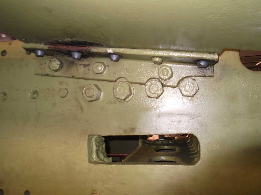 The replacement of worn fasteners continued this week with a fitted bolt in the trailing right-hand hornblock casting. The hole was reamed last week and the new bolt made this week. However the surface of the casting was very uneven resulting in little surface contact with the nut on the bolt so the spotface was re-cut. The new bolt has now been fitted. A similar worn fitted bolt was removed from the leading right hornblock casting and the hole reamed. Again the surface under the nut was poor, requiring the spotface to be re-cut.