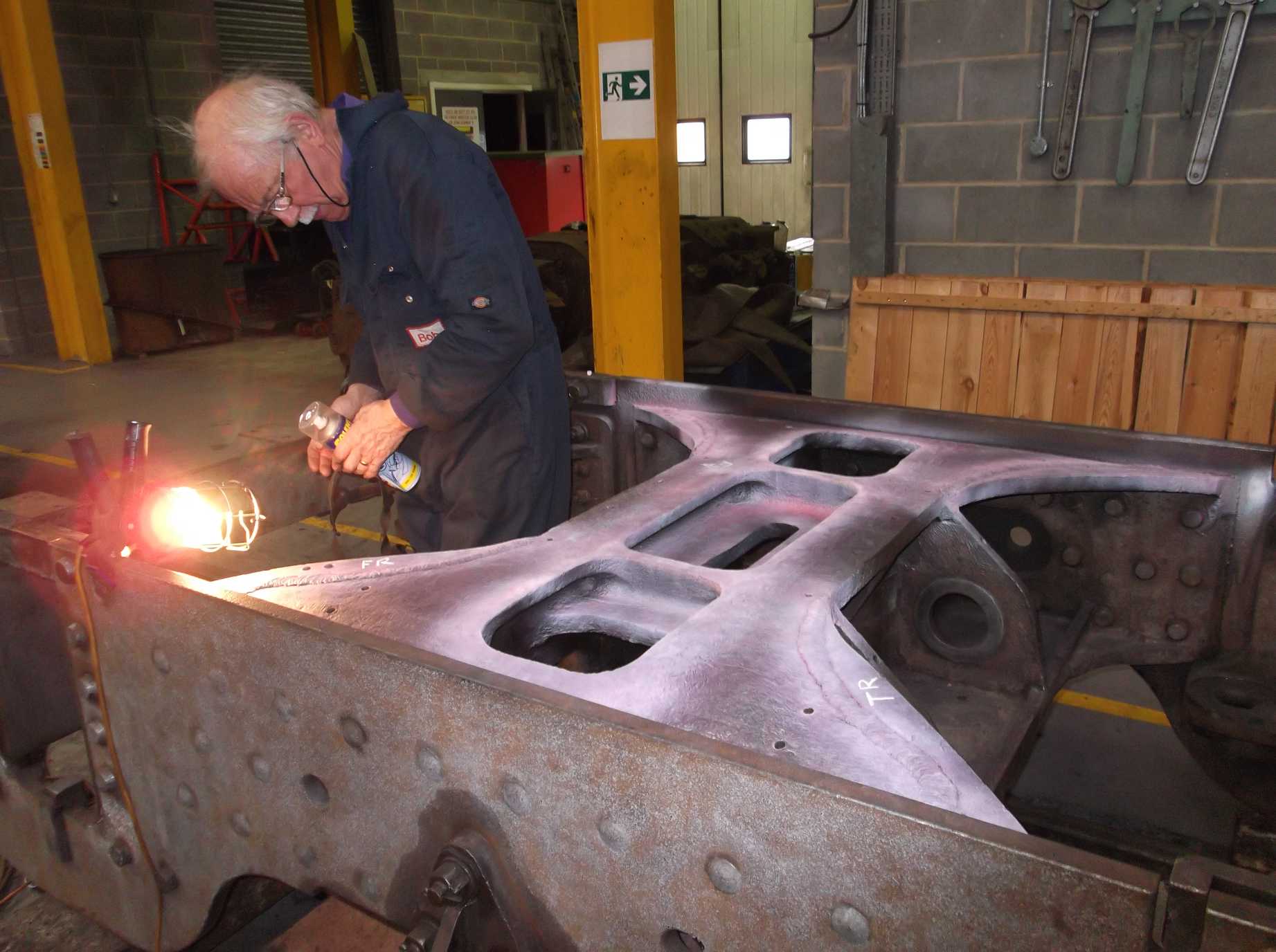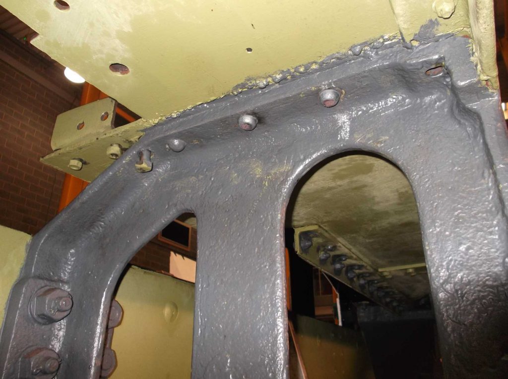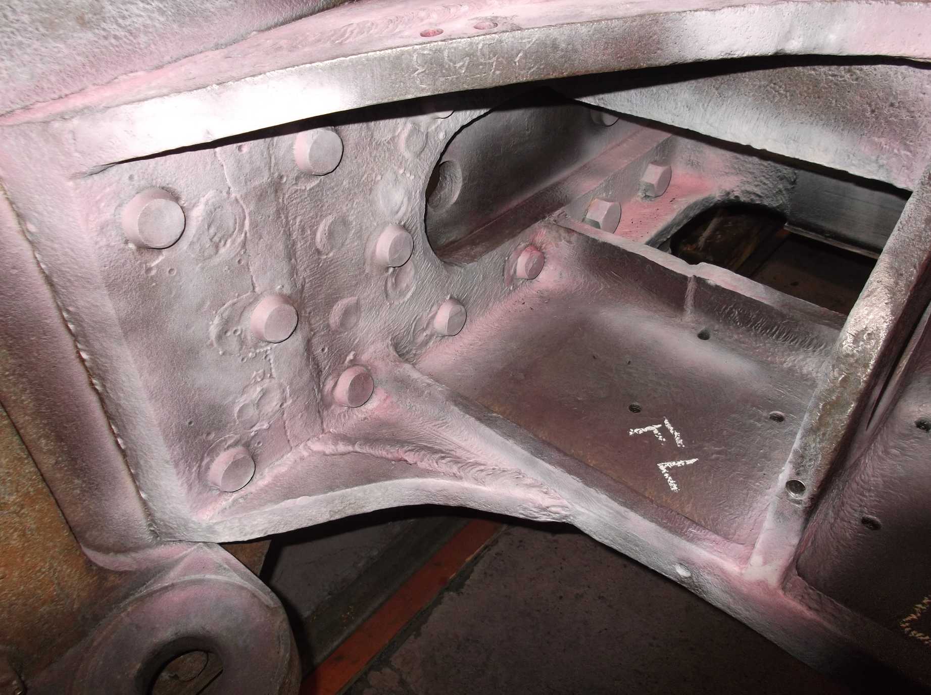 The last remaining corners behind the front bufferbeam were needle-gunned and primed this week, leaving just the area around the Cartazzi and the bogie stretcher to do. Alan had previously finished stripping and descaling the underside of the bogie and this week its detailed inspection began. The bogie centre casting was di-pen inspected this week. The bogie frame rivets and fitted bolts were also examined and all have proved to be tight.