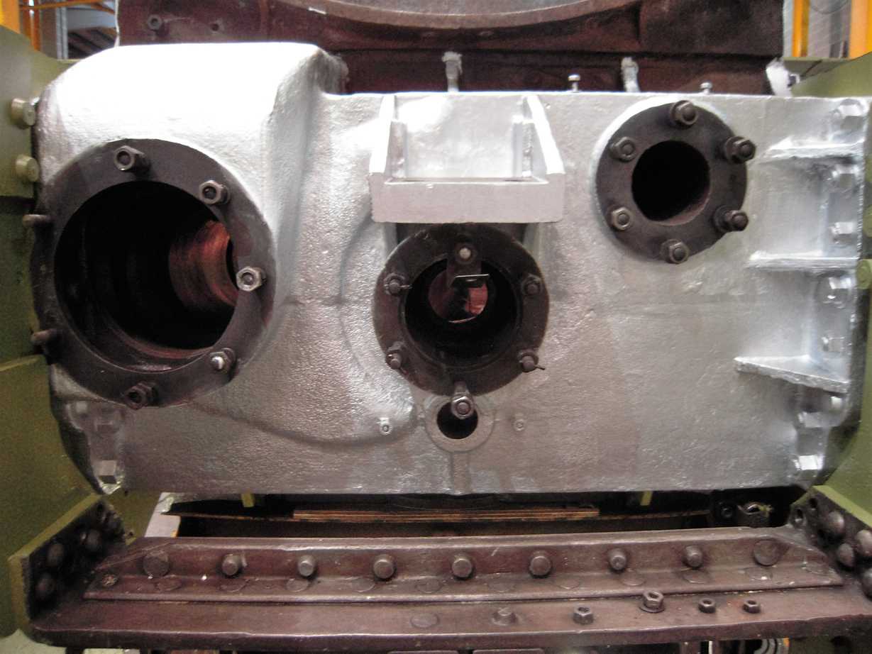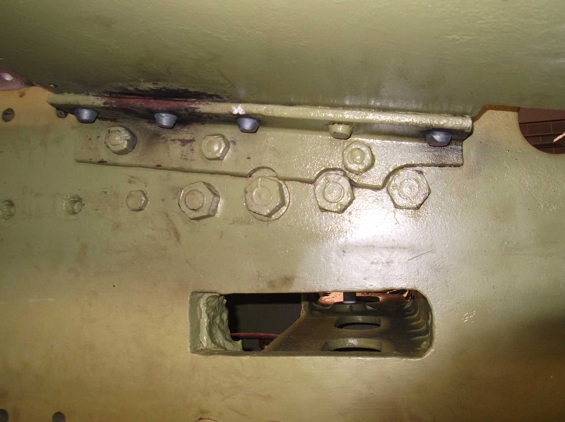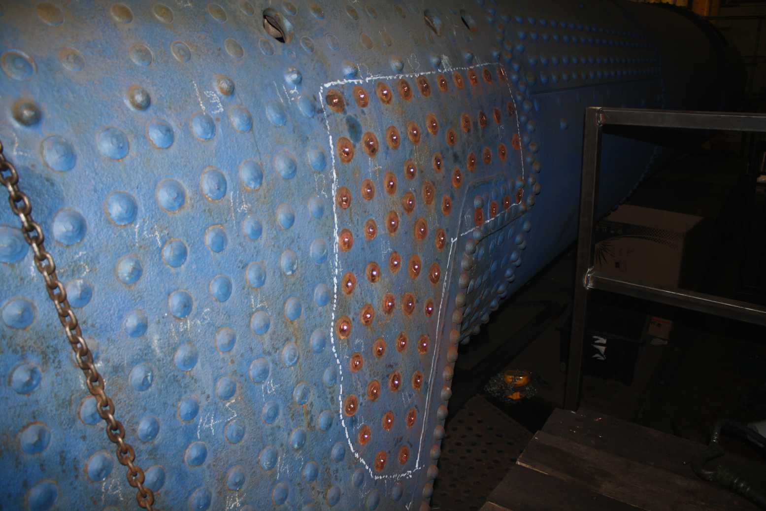 The last remaining corners behind the front bufferbeam were needle-gunned and primed this week, leaving just the area around the Cartazzi and the bogie stretcher to do. Alan had previously finished stripping and descaling the underside of the bogie and this week its detailed inspection began. The bogie centre casting was di-pen inspected this week. The bogie frame rivets and fitted bolts were also examined and all have proved to be tight.