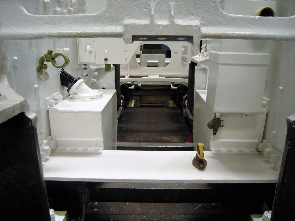 Painting of the loco frames and major castings around the front of the locomotive continued. The final coat of gloss was applied to the outside-front bufferbeam area. Progress was also made on priming the middle cylinder and the saddle casting.