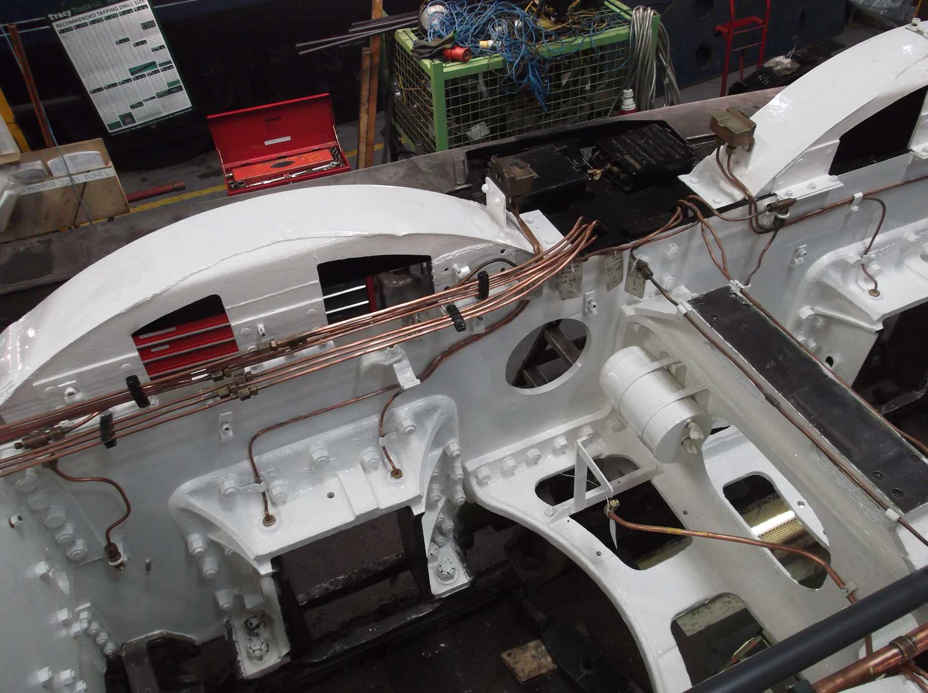 Work was also carried out under the tender. Cleaning between the frames has enabled the various pipe runs and conduit to be marked and a photo survey has been carried out. Now this has been competed, a start has been made on the removal of components that will enable the areas where the tender tank meets the chassis to be viewed and inspected.