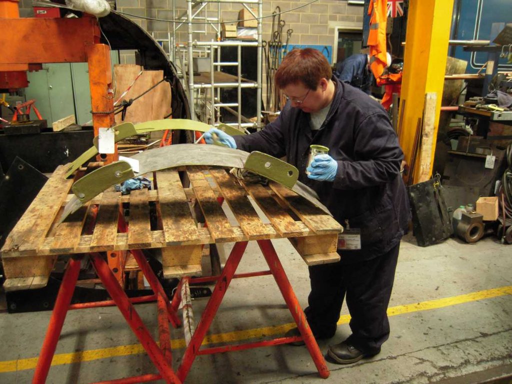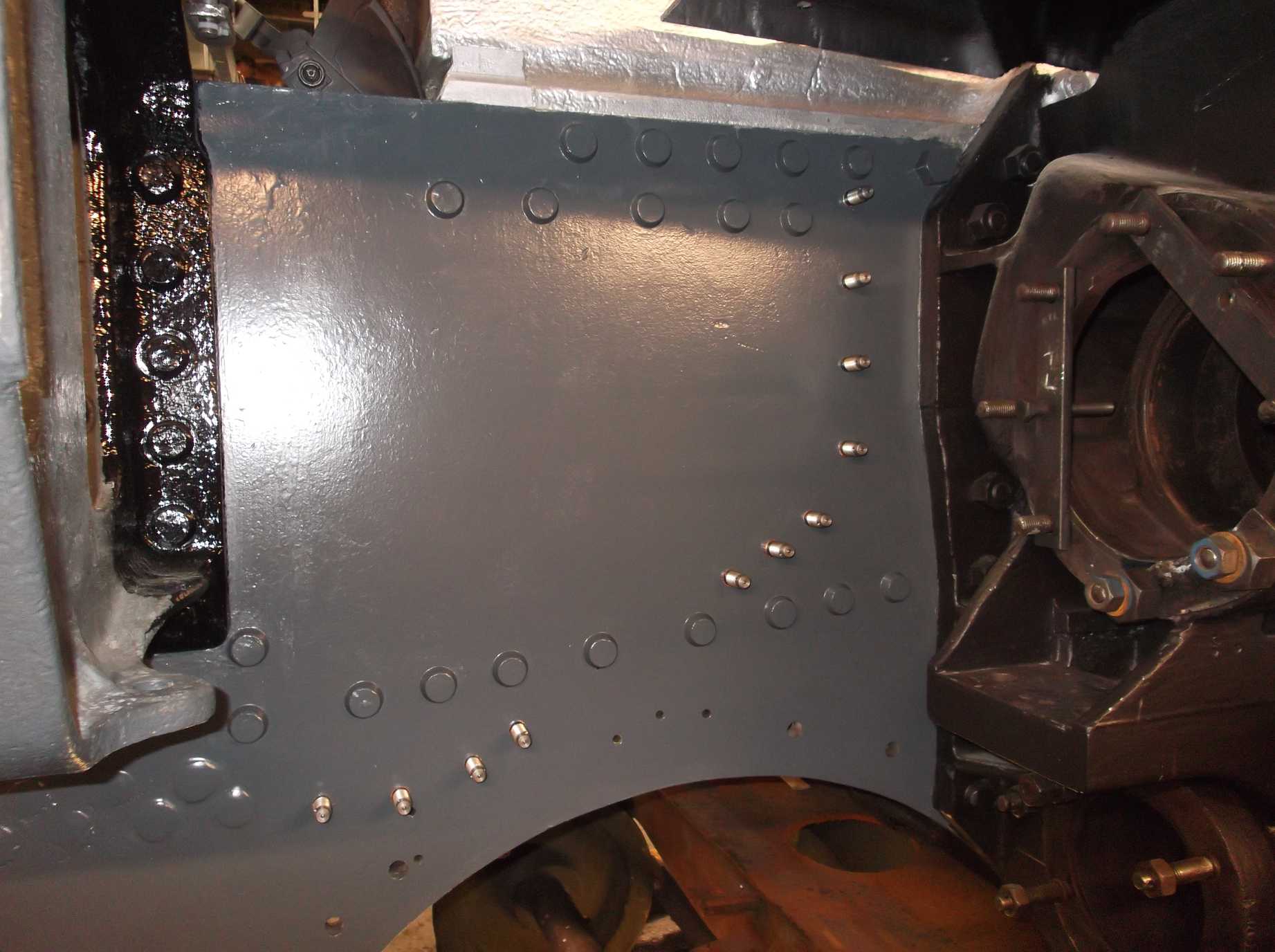 The bogie splashers that were repaired last week have now received gloss top coats. The mounting bolts have been die nutted and cleaned and a start has been made in the preparation of the bogie cover plates for fitting.