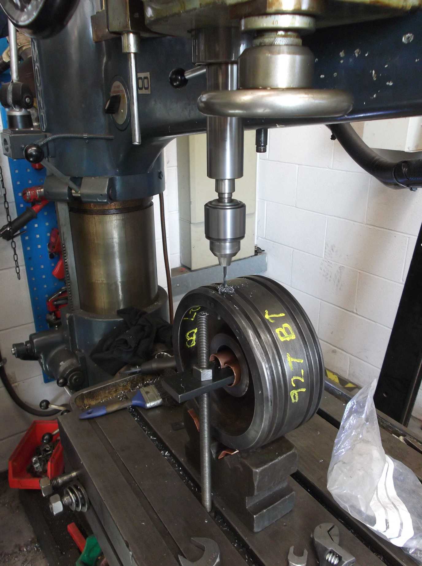 The valve heads were removed from their spindles last week for machining to suit the new valve liners. Before machining can begin, the ring pegs require removal. These pegs project into the ring grooves to stop the piston valve rings from rotating around the valve head. They are screwed into the valve head, then machined flush with the valve head. A preliminary attempt was made to see if the pegs would unscrew, but unsurprisingly they would not, so we proceeded to drill them out. This was done using the National Railway Museum’s Richmond radial arm drill. By the end of the week they had all been drilled out, but the threaded holes still require clearing of the remains of the peg threads.