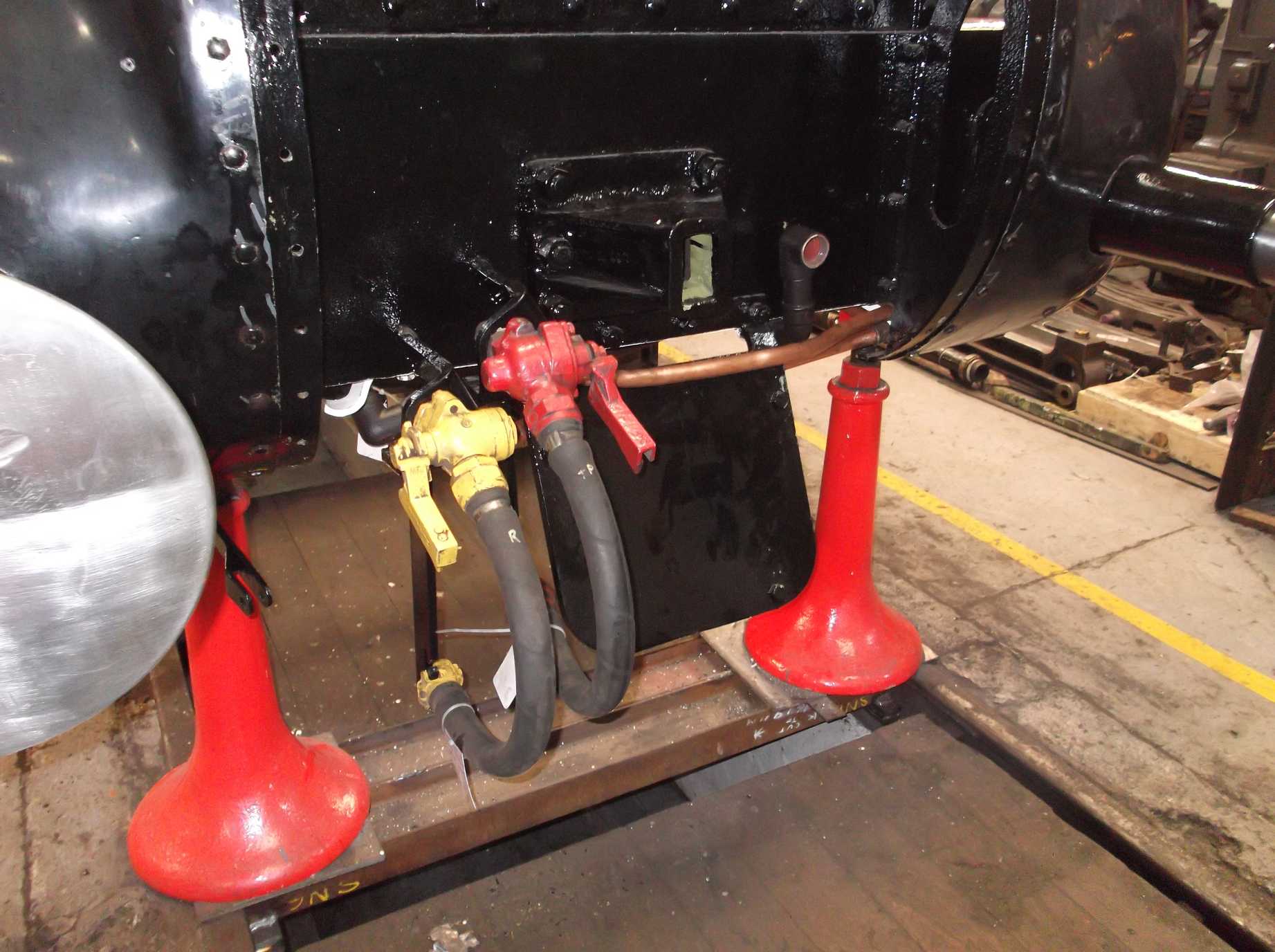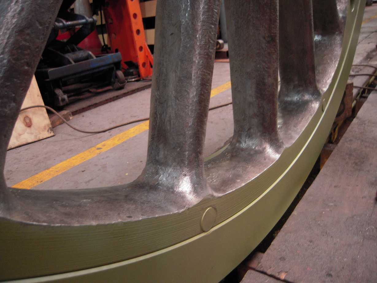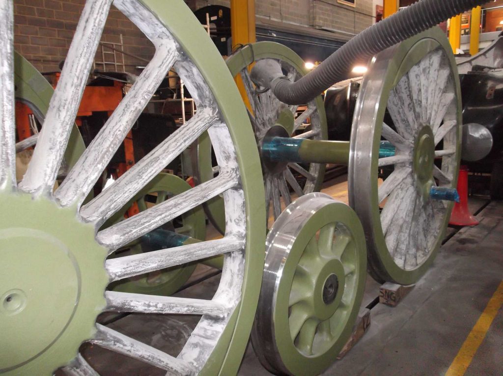 The wheelsets returned from re-tyring are now looking very good, as remarked by a number of observers last week. The tyre edges, balance weights and axle ends are now prime painted and we are trialling filling some of the spokes on one of the coupled wheels. We know other locos have had their spokes filled before painting and it does help in cleaning when the loco is back in traffic, as well as looking really good.