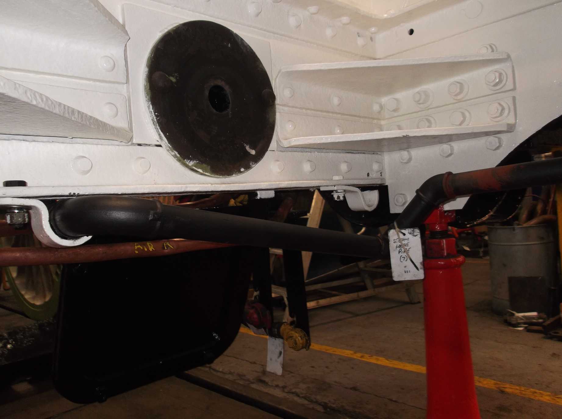 As riveting around the leading vacuum cylinder stretcher is now complete, the air brake pipe runs in this area can be installed and this was progressed this week. Meanwhile, work continues on cleaning the pipework retrieved from store. The bolting for the flanges on the steel pipework for vacuum and steam heat have been removed and are being cleaned and die-nutted.