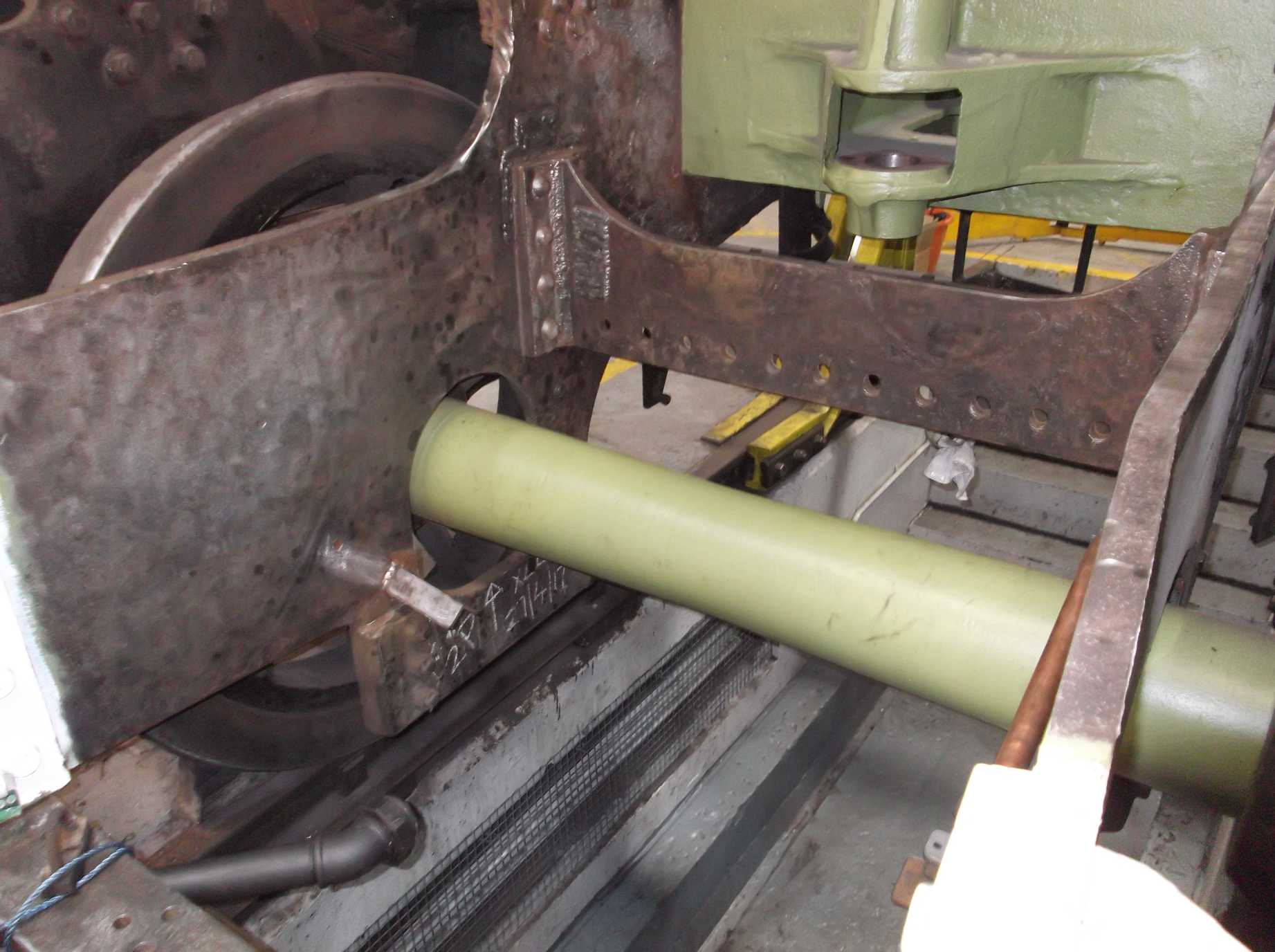At the Cartazzi end of the loco, the damper bracket mounting bolts have been drilled out. The bracket was needle gunned and is now ready for painting. New bolting will be required. Other work in this area included dye pen inspection of the frames and stretchers. This part of the inner Cartazzi frames shows the age of the loco the most and requires careful inspection. No faults were found, so a coat of primer was applied all round from the rear of the mainframe lap to the diaphragm plate stretcher.
