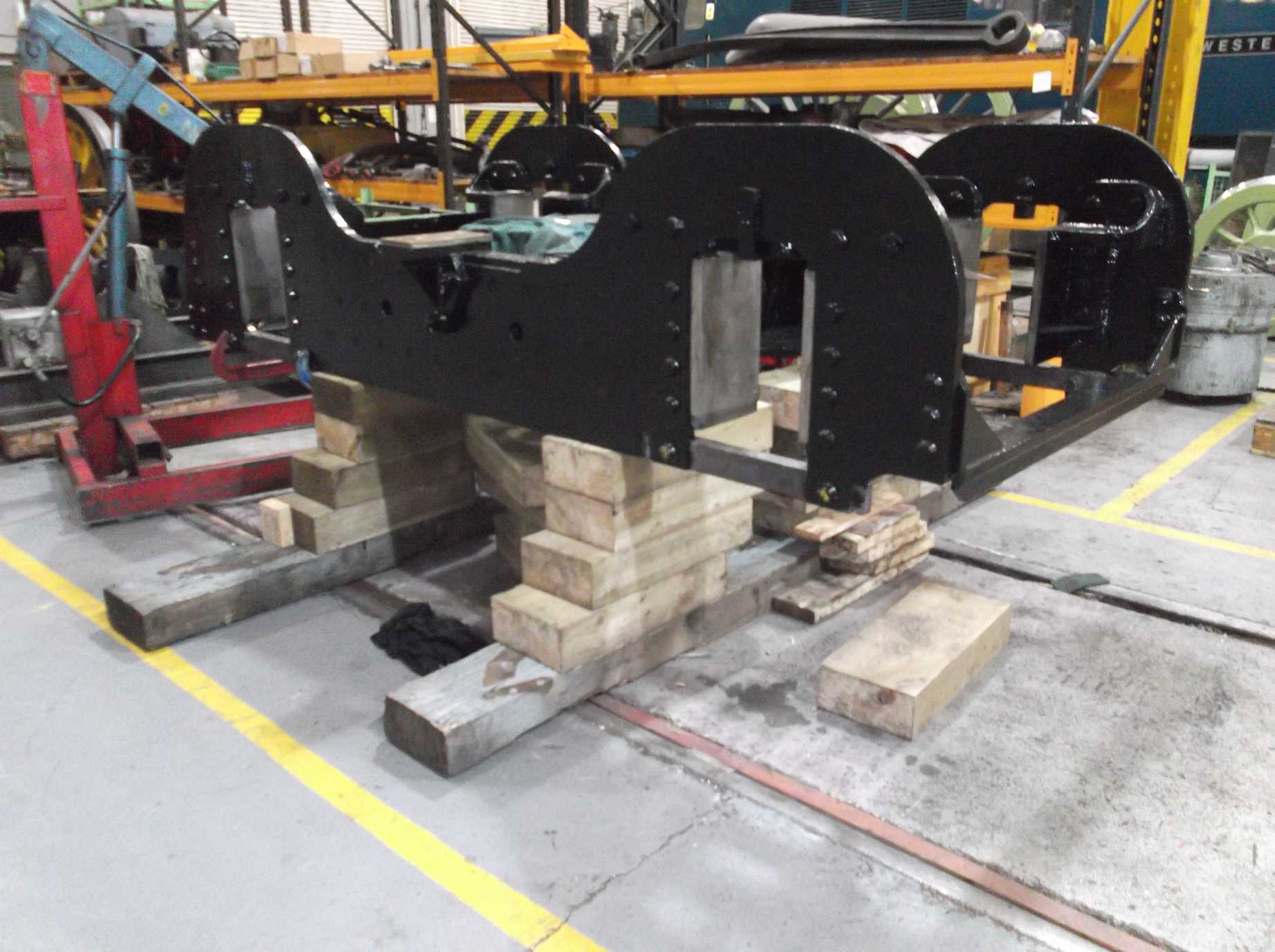 The bogie wheelsets are now being painted in primer. Before fitting the wheelsets to the bogie we need to fit new bolting to the bogie horn stays. To make this work easier the bogie frames were lifted and place on packing, as these bolts are on the bottom edge of the frames. The bolt blanks have now been received.