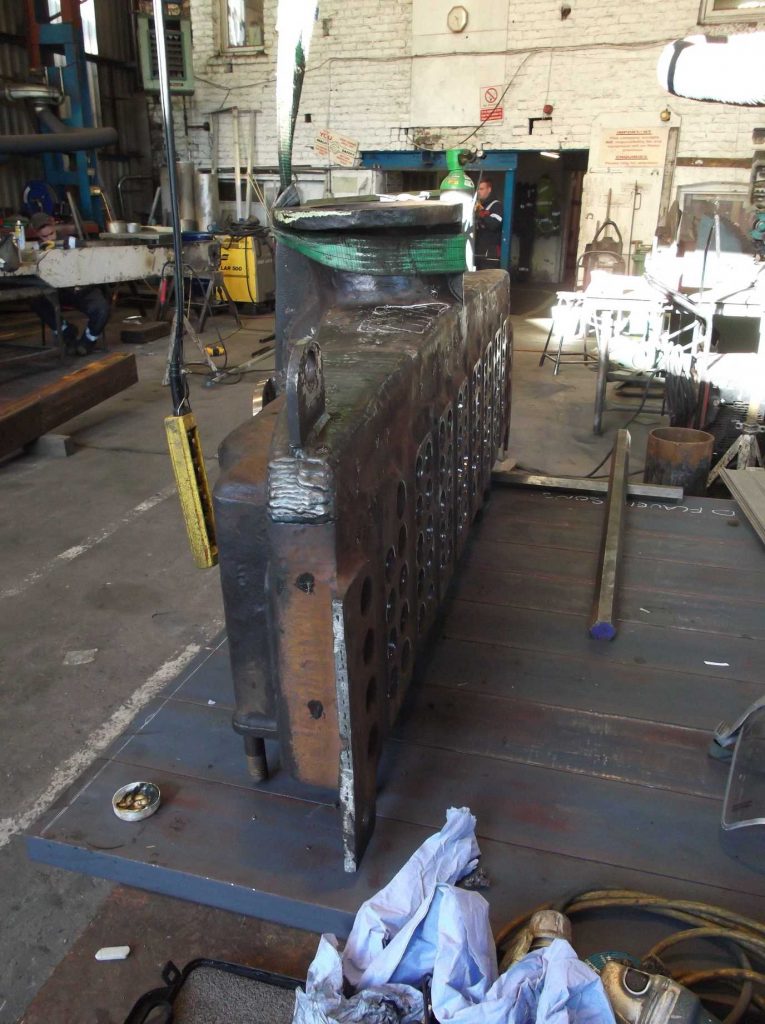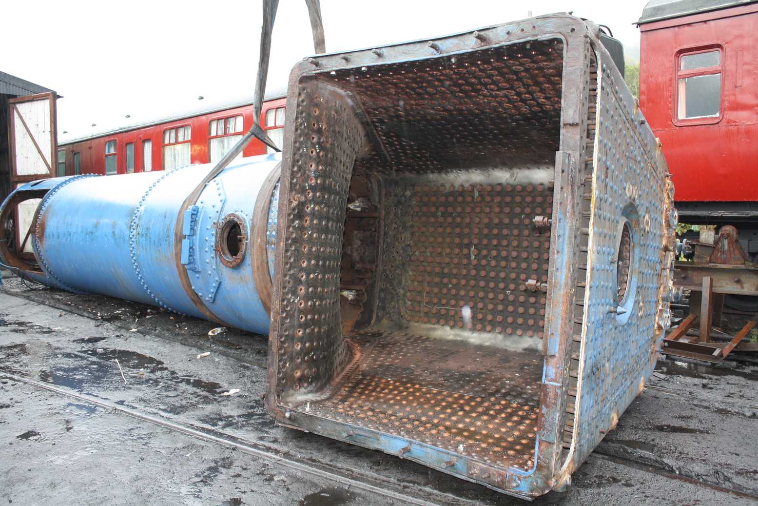 At Llangollen the boiler has been shunted outside of the works. Then their crane was used to turn the boiler onto its side and the boiler was returned to the boiler shop. Work can now continue on the repair of the combustion chamber plates.